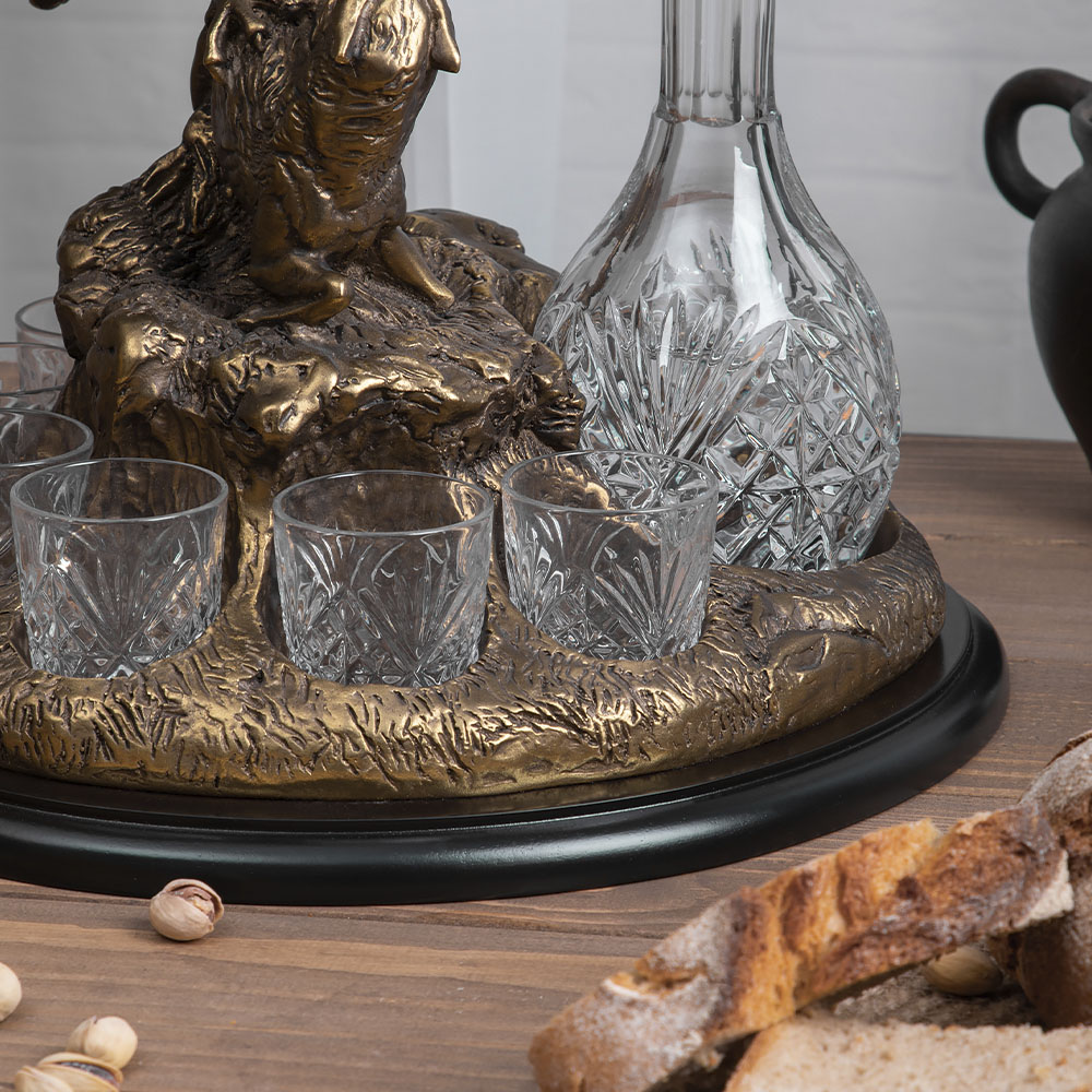 Безупречное исполнениеСкульптурная часть имеет уникальный дизайн и отличается высочайшим качеством исполнения. При ее изготовлении используются самые современные технологии обработки и такие высококачественные материалы, как коелгинский мрамор, предельно прочный и долговечный. Стопки и графин изготовлены из хрусталя.