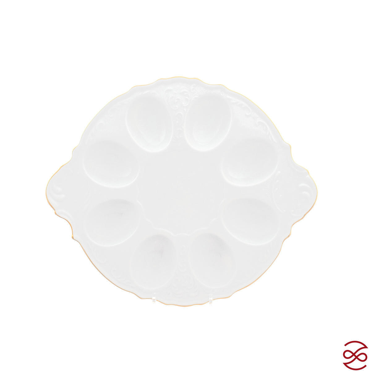 Для идеальной подачи фаршированных яиц, целых и половинками, а также для создания яркого акцента сервировки. Поднос для яиц Bernadotte Белый узор будет долго радовать вас своими безупречными формами и утонченным дизайном! Фаршированные яйца или крашенки во время пасхальных праздников будут замечательно смотреться на таком блюде! Диаметр: 25 см, удобные ушки-ручки по бокам изделия.