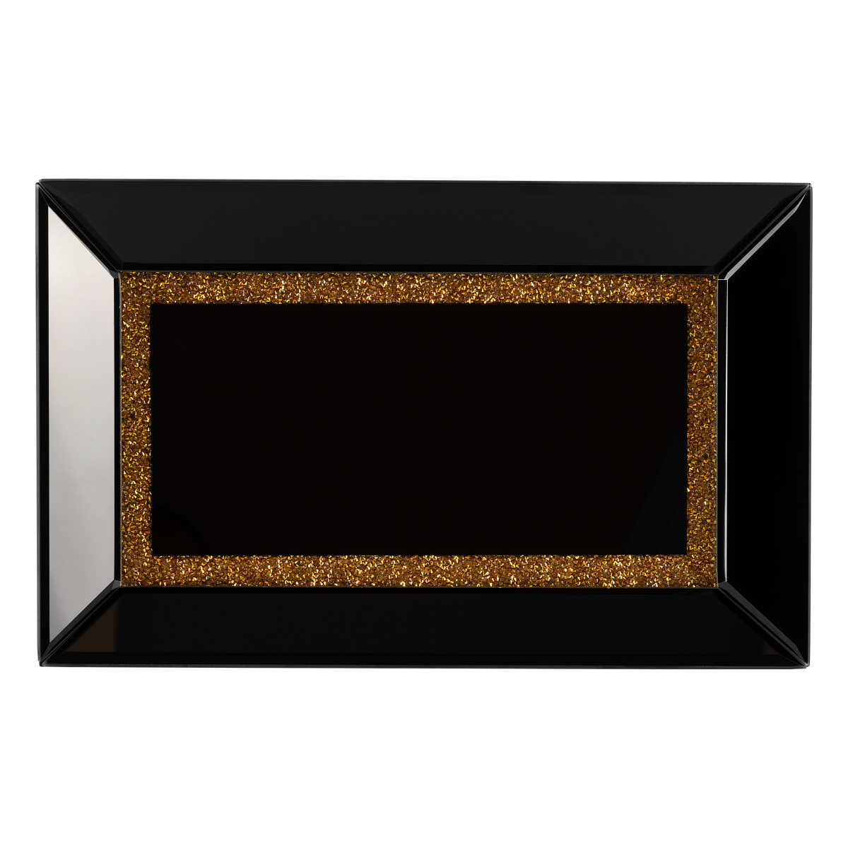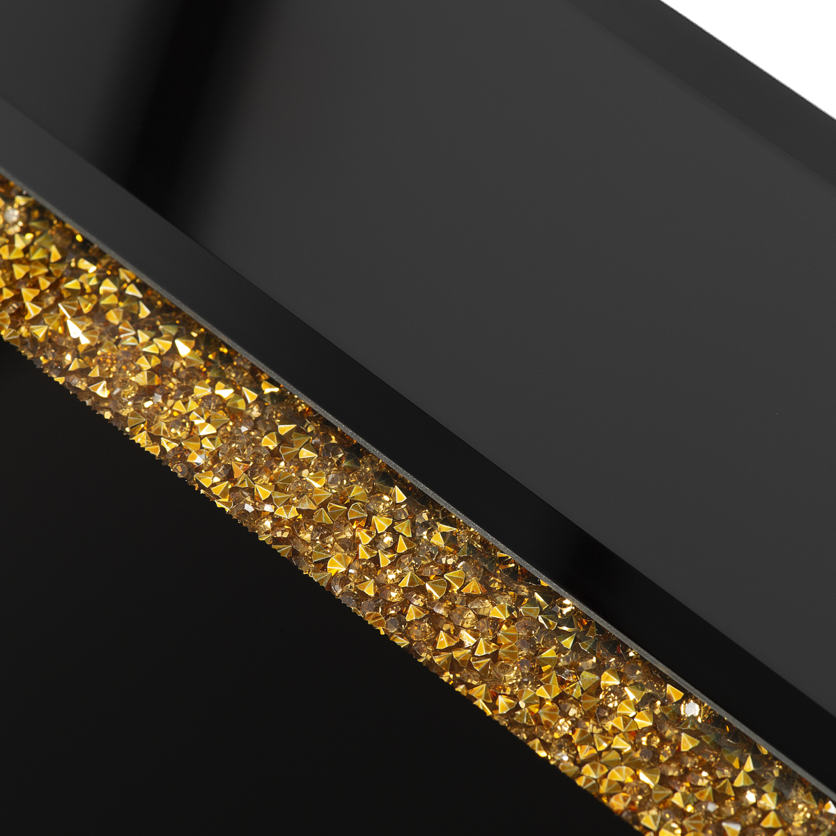 Поднос Gipfel Evora 42894. Размер 32x20x3 см. Изготовлен из МДФ и стекла. Глянцевая черная стеклянная поверхность подноса играет переливами граней и сверкающими золотистыми стразами под стеклом. На дне расположены миниатюрные мягкие ножки, не царапающие поверхность мебели.