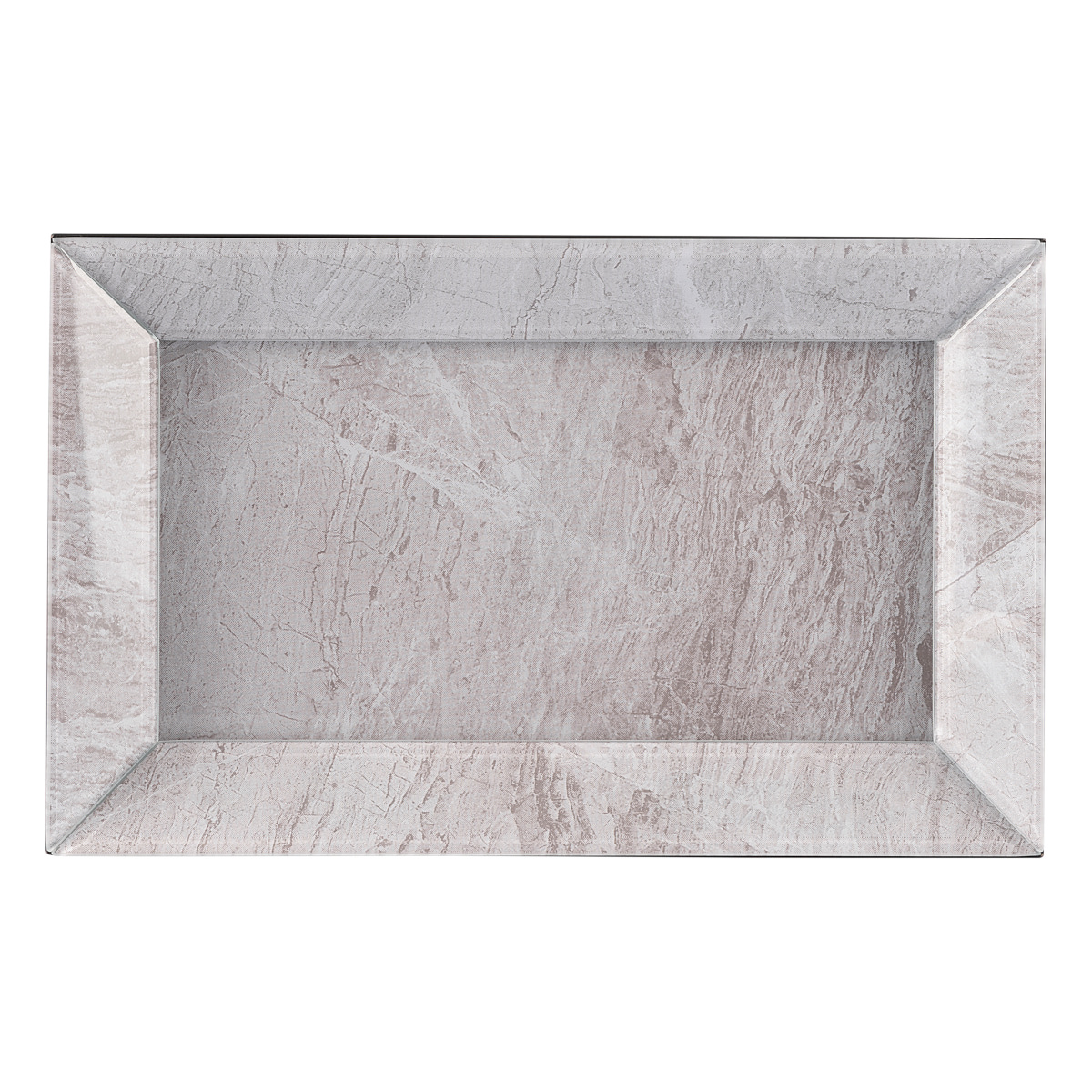 Поднос Gipfel Stone 42899. Размер 32x20x3 см. Изготовлен из МДФ и стекла. Поверхность глянцевая стеклянная с имитирующим мрамор принтом серого цвета в легком сиреневатом оттенке. На дне - мягкие миниатюрные ножки, не царапающие поверхность мебели.