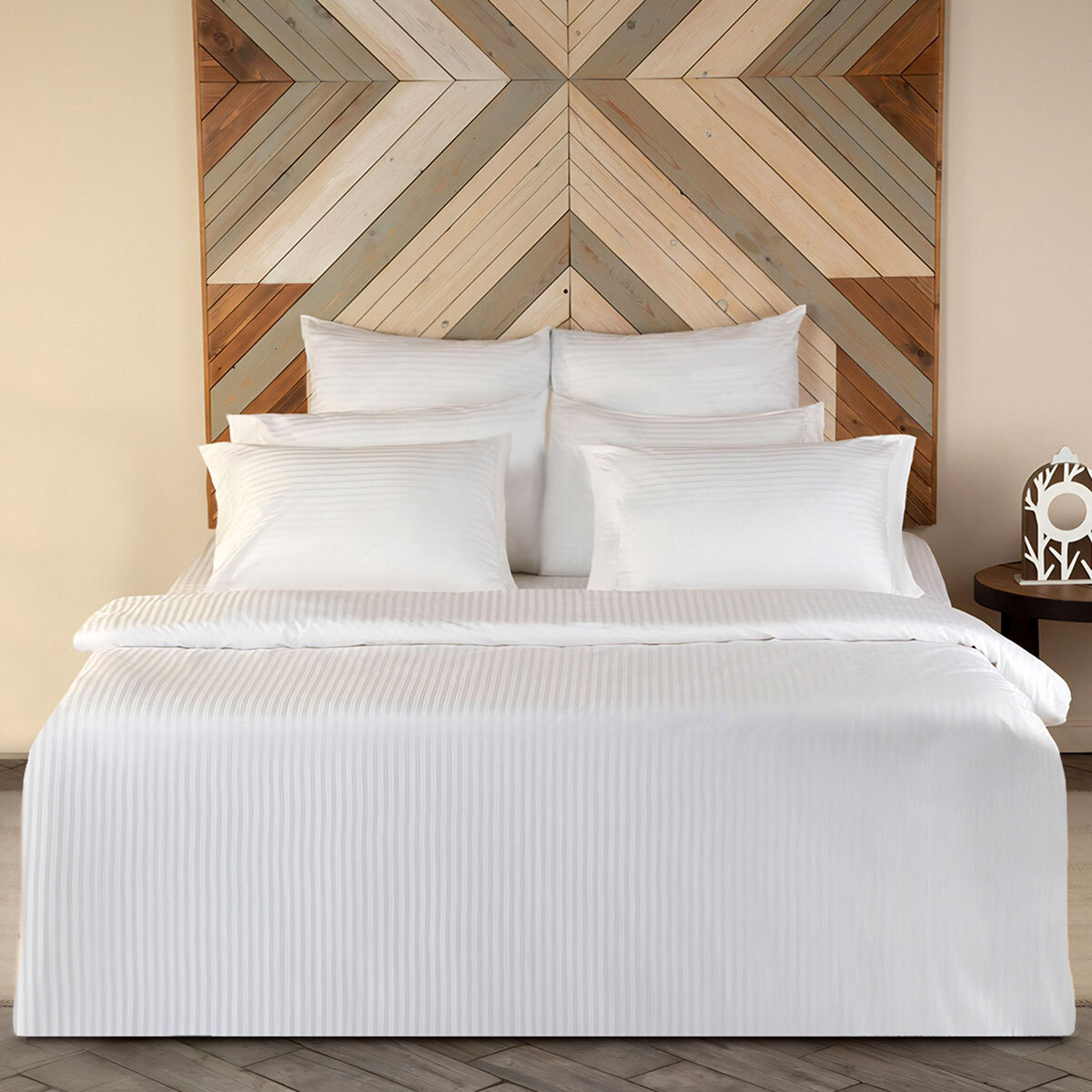 Пододеяльник выполнен в белом цвете. Белый цвет добавляет изысканности и гармонии интерьеру спальни и располагает к безмятежному отдыху. Выбитый рисунок в виде контрастных полос с матовой и глянцевой поверхностью придает изделию роскошный и элегантный вид.