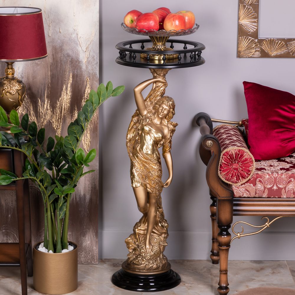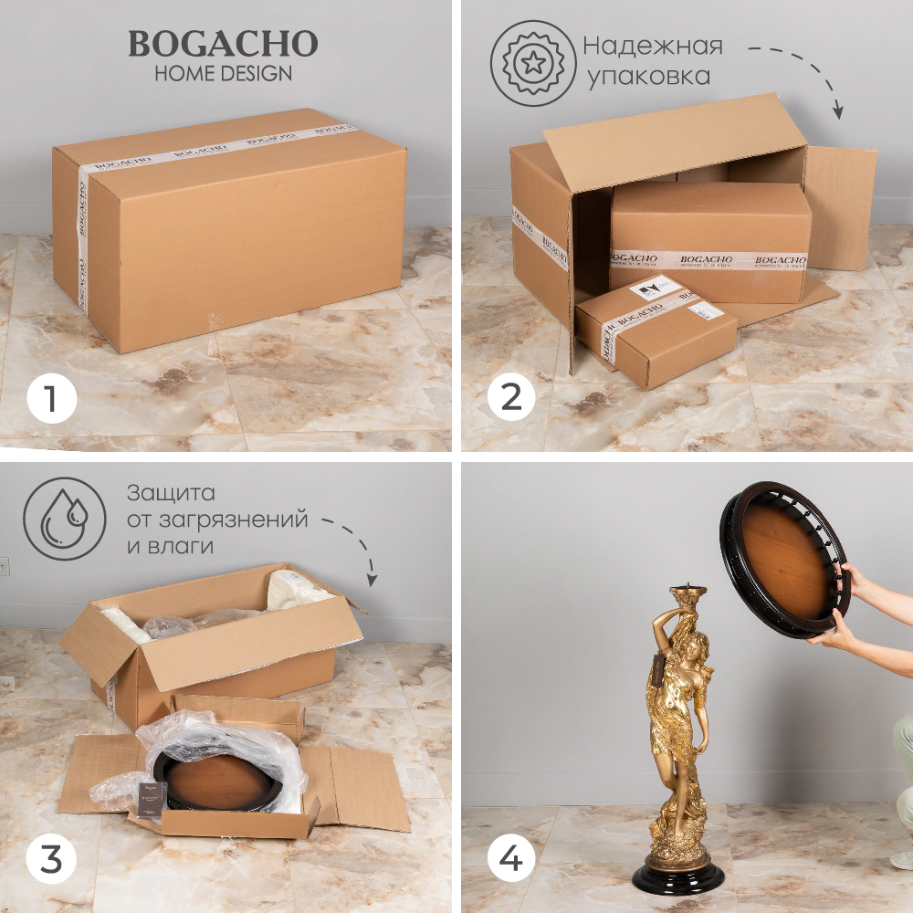 Материалы изготовления и размеры изделияИзделие производится из высококачественного коелгинского мрамора, который привозится в виде мраморной крошки, затем отливается вручную и подвергается дополнительной обработке — патинированию и золочению поталью.