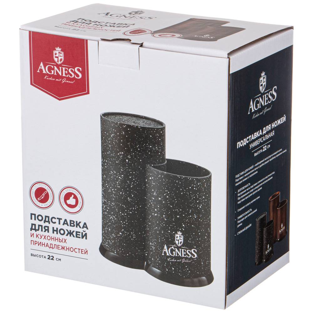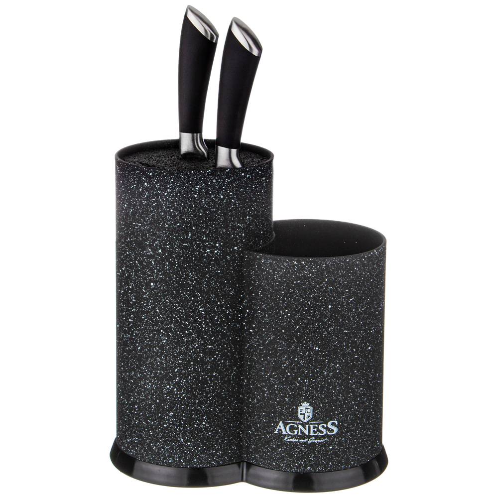 Подставка для ножей – необходимый аксессуар на каждой кухне. Подставка AGNESS с наполнителем легко и удобно решает проблему хранения ножей, защищая лезвия ножей от загрязнения. Дополнительный отсек можно использовать для хранения различных кухонных аксессуаров.