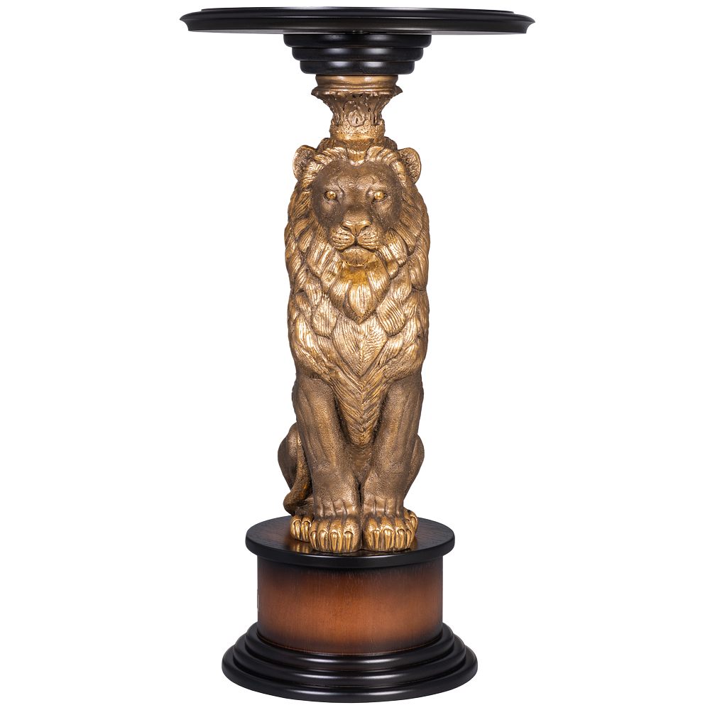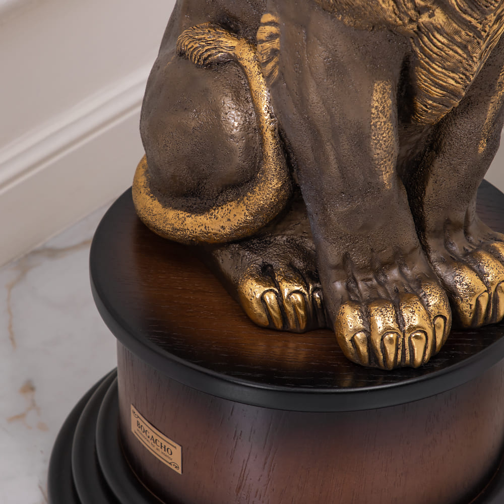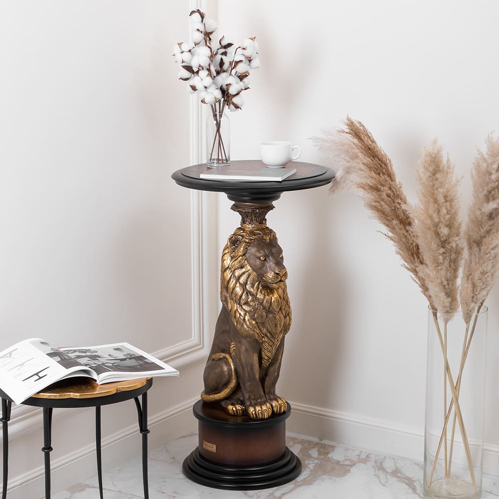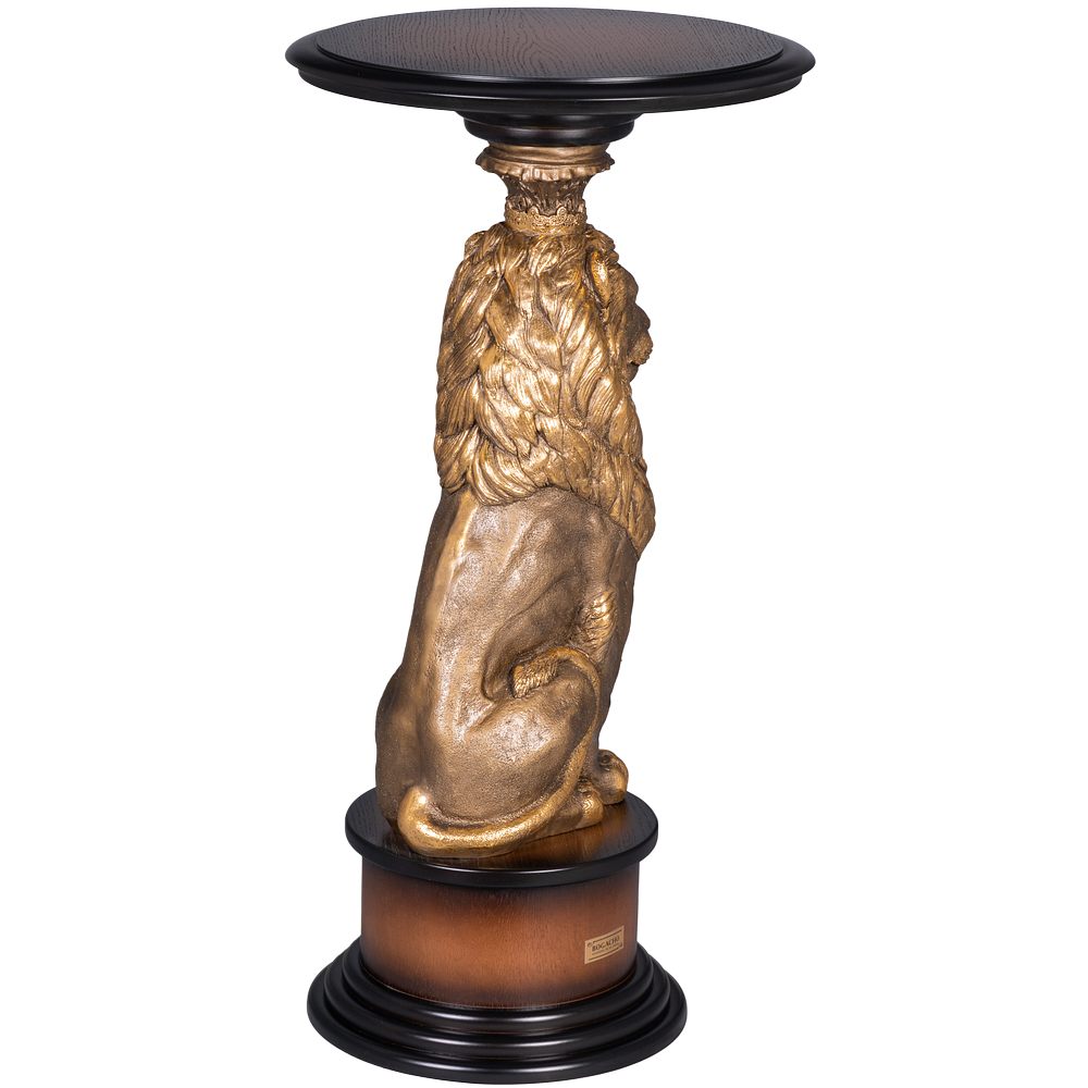 Благородный лев является опорой для столешницы из плитного материала Мдф, который изготавливается путём спрессовывания древесной крошки под высоким давлением, благодаря чему изделие очень прочное и лёгкое. Поверхность шпонирована натуральным деревом дуба, тонирована и покрыта лаком. Из этого же материала сделан пьедестал, на котором расположена скульптура. Лев отлит вручную из мрамора высокого качества и окрашен в технике патинирование.
