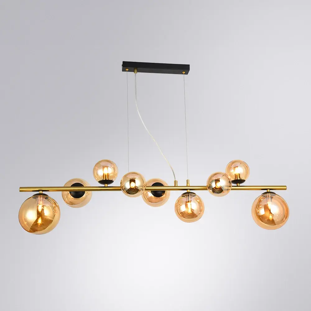 Подвесная люстра Arte Lamp A2243SP-9PB в стиле модерн создаст выразительный световой акцент в интерьере. Модель с девятью янтарными стеклянными плафонами, направленными в стороны, излучает теплый и уютный свет. Медное покрытие металлической арматуры гармонично сочетается с теплым тоном стекла, создавая цельную композицию. Люстра крепится на планку и предназначена для галогенных ламп, обеспечивая комфортное освещение. Итальянский бренд гарантирует качество и долговечность своей продукции.