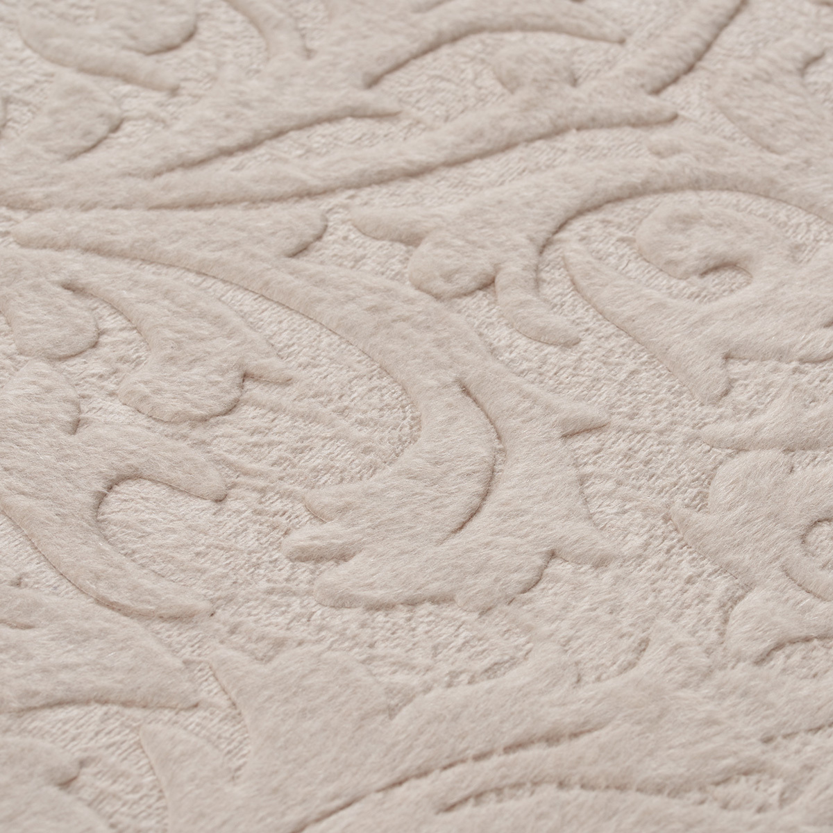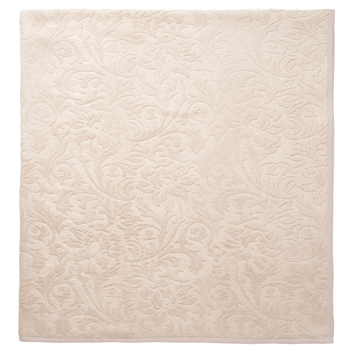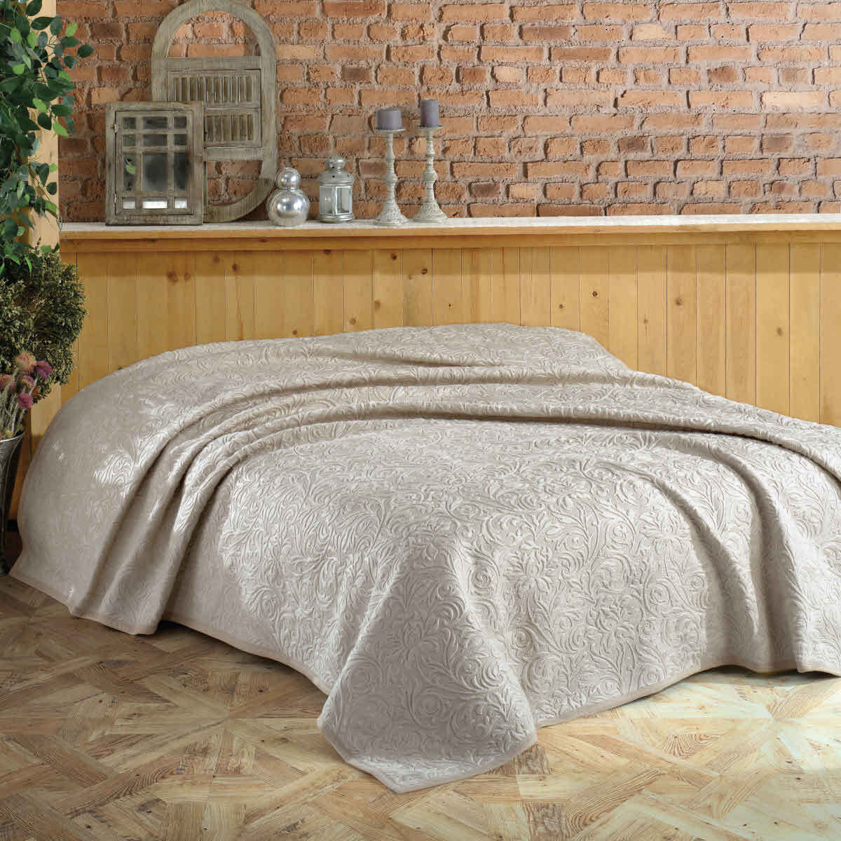 Выбитый изысканный флористический орнамент на покрывале переливается роскошными золотисто-бежевыми цветами.