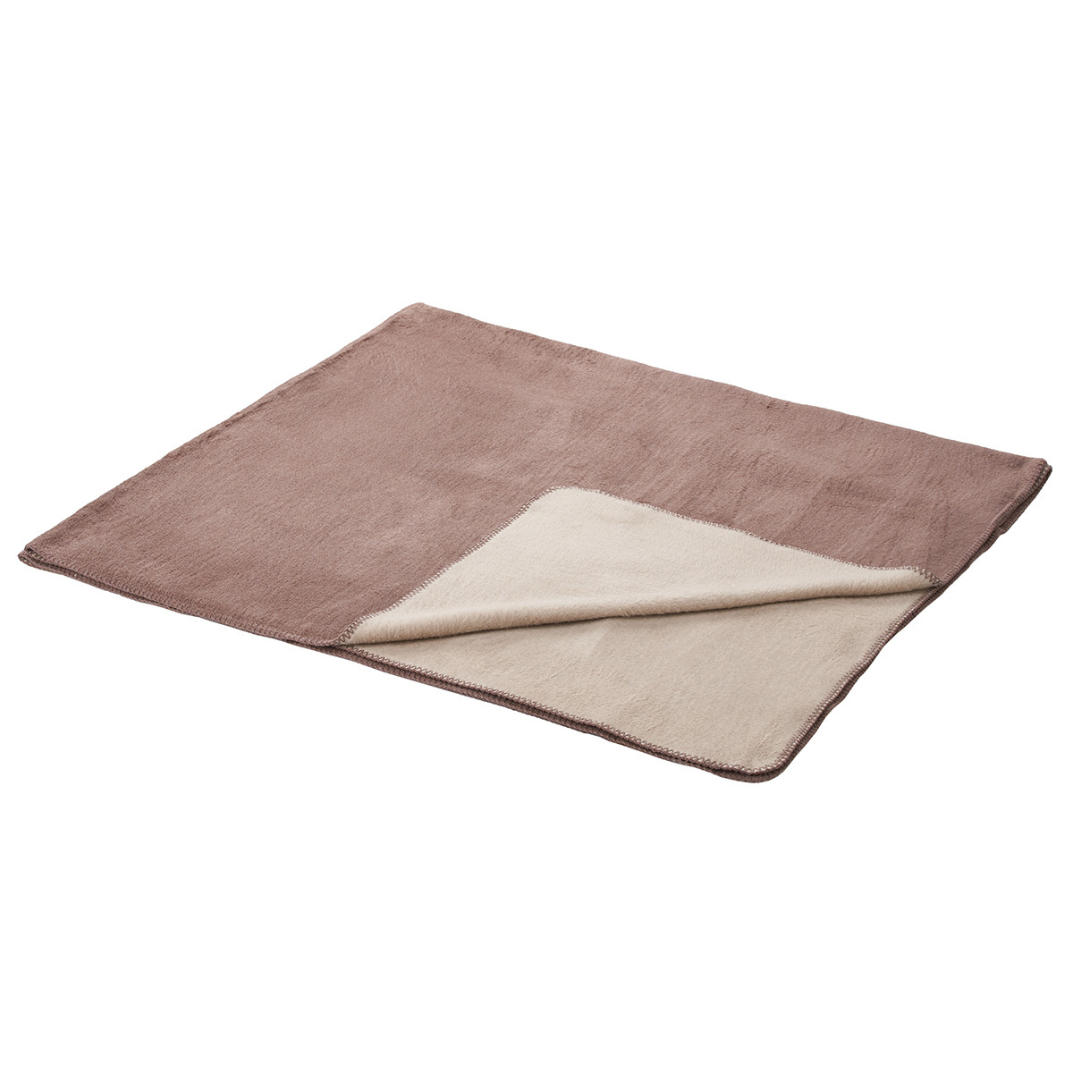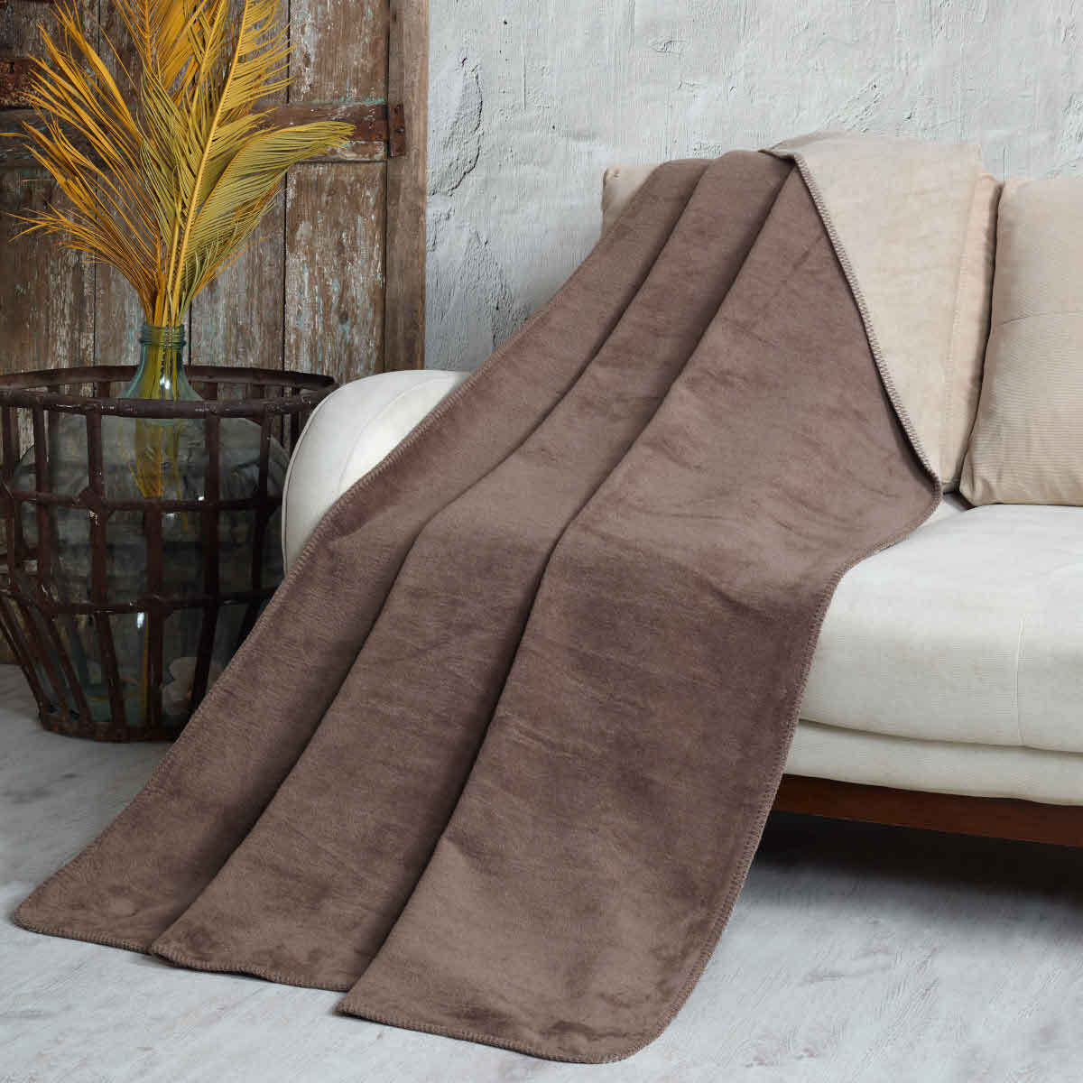 Покрывало смотрится как мягкий бархат. Одна сторона в аристократическом оттенке тауп – смешение серого и коричневого тонов, другая – в шоколадно-коричневом цвете. Две стороны пледа создают стильный контраст, изделие выглядит нарядно.