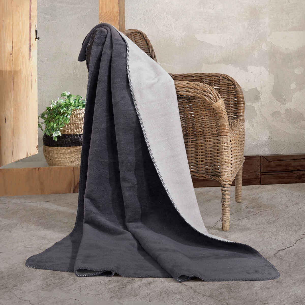Покрывало смотрится как мягкий бархат. Одна сторона жемчужно-серого цвета, другая – в аристократическом цвете графита. Две стороны пледа создают стильный контраст, изделие выглядит нарядно.