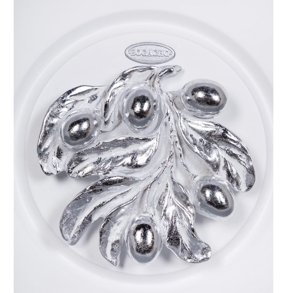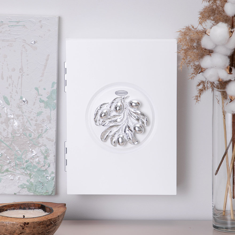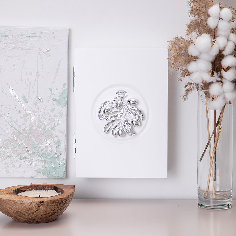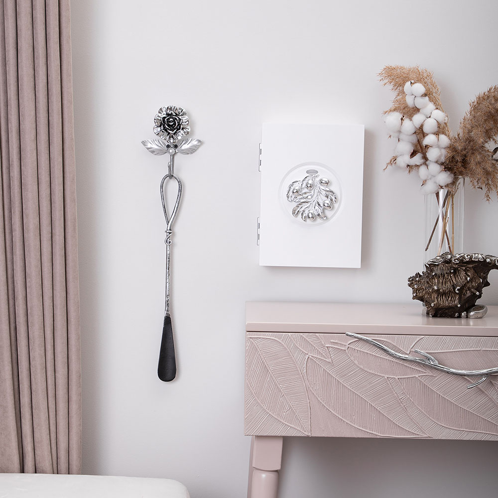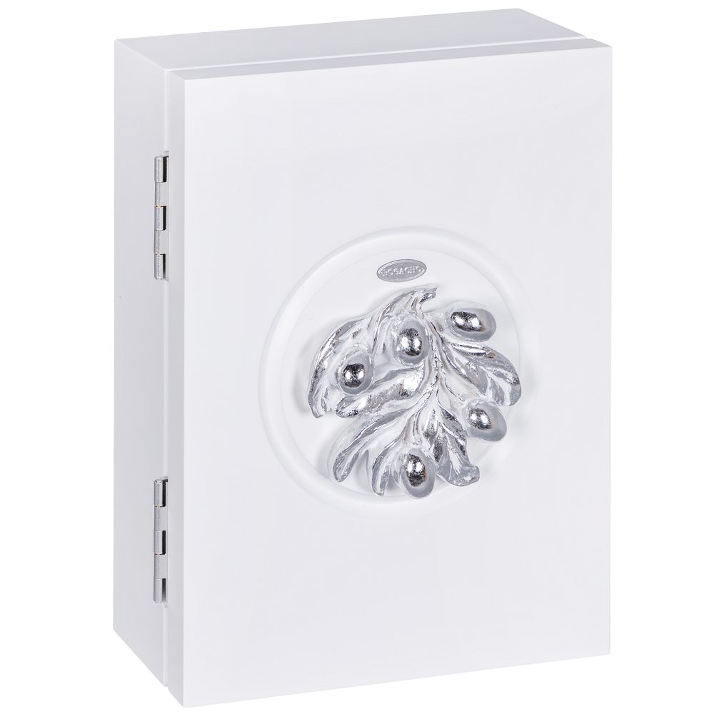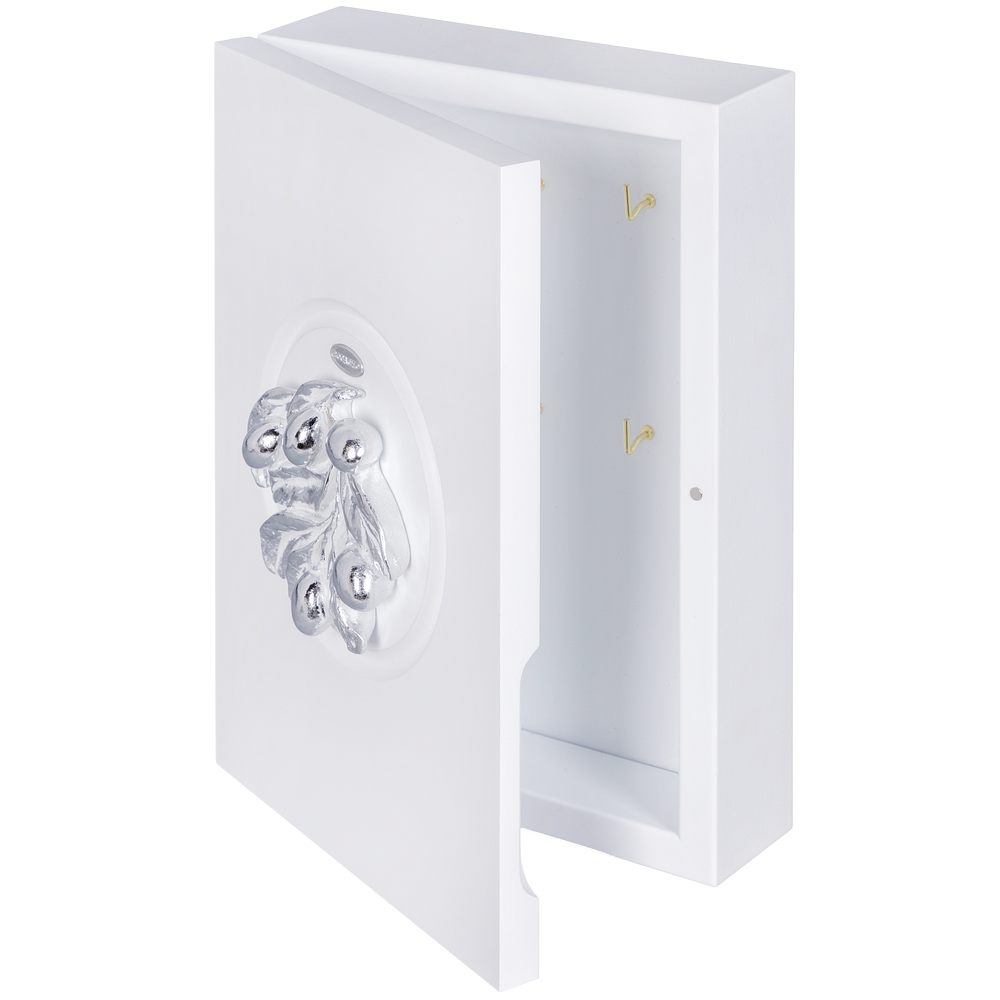 Полка ключница Oliva Branch 2 Айс Античное серебро на 6 комплектов ключей. Сделана в виде шкафчика. Лицевая сторона шкафчика украшена декоративной композицией.Ключница изготовлена из мдф.