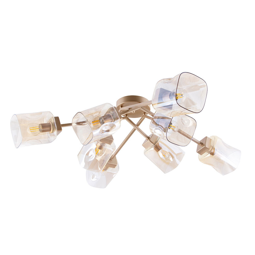 Светильник A2318PL-8SG серии . Подчеркнет стиль помещения. Высота 26 cm. Диаметр 82 cm Параметры пылевлагозащиты IP — 20. Плафон стеклянный цвета янтаря, а материал/цвет арматуры металл/золотистый. Использует лампу с цоколем E14. Идеально подходит для кухни, для спальни, для гостиной. Страна происхождения бренда — Италия.
