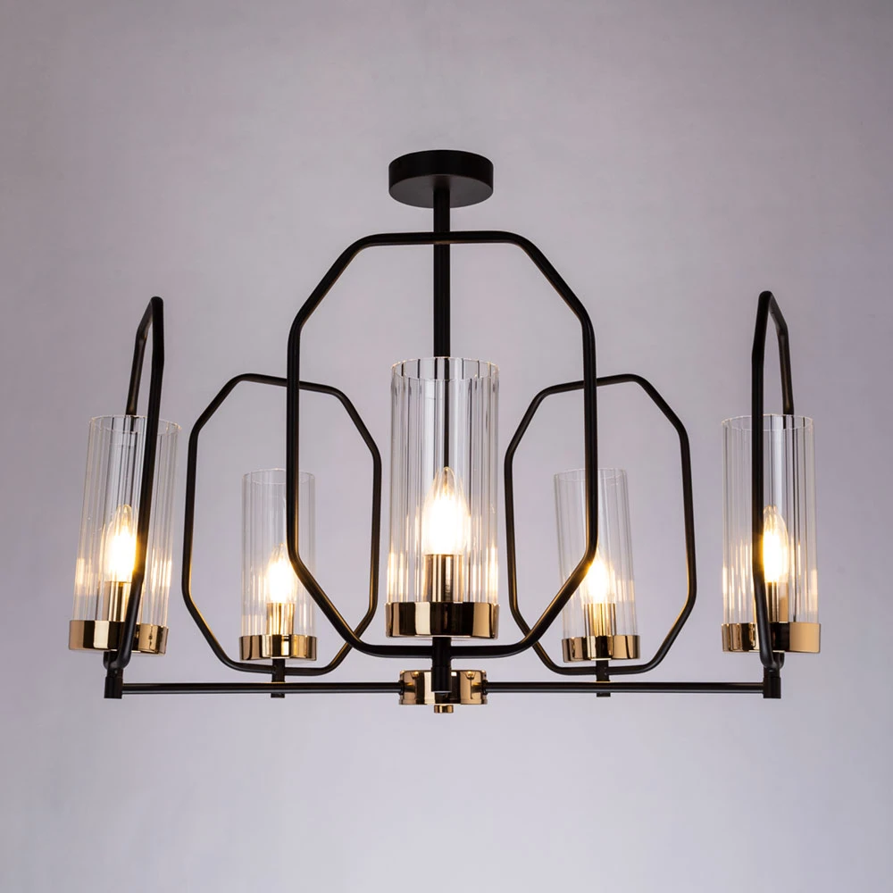 Потолочная люстра Arte Lamp A7004PL-5BK в стиле неоклассика сочетает в себе современные технологии и элегантность. Модель с пятью прозрачными стеклянными плафонами, направленными вверх, создает равномерное и комфортное освещение. Прочный черный металлический каркас гарантирует долговечность. Светильник предназначен для светодиодных ламп и монтируется на потолок при помощи скобы. Идеальное решение для тех, кто ценит четкие формы и сдержанную классику в интерьере.