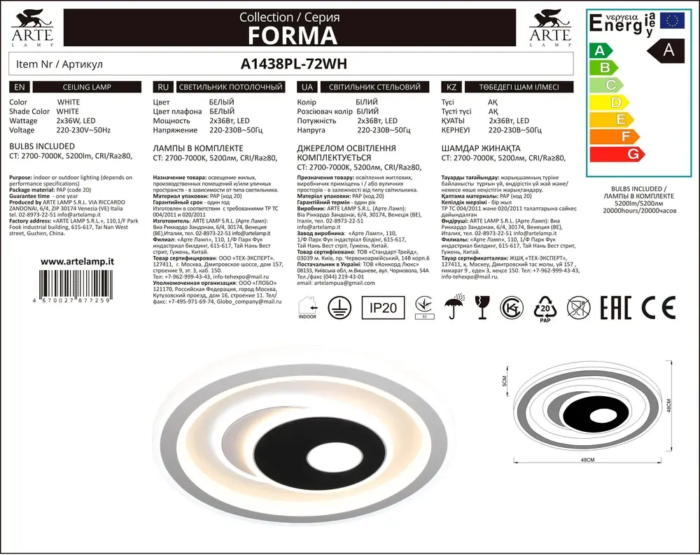 Потолочная люстра Arte Lamp A1438PL-72WH — это современное решение для вашего интерьера. Модель с белыми акриловыми плафонами и металлической арматурой создает строгий и лаконичный образ. Светильник равномерно направляет свет вниз, обеспечивая комфортное освещение. Встроенные светодиодные источники света отличаются энергоэффективностью и долгим сроком службы. Управление освещением становится еще удобнее благодаря пульту дистанционного управления. Люстра монтируется на потолок и гармонично впишется в пространство, выполненное в современном стиле.