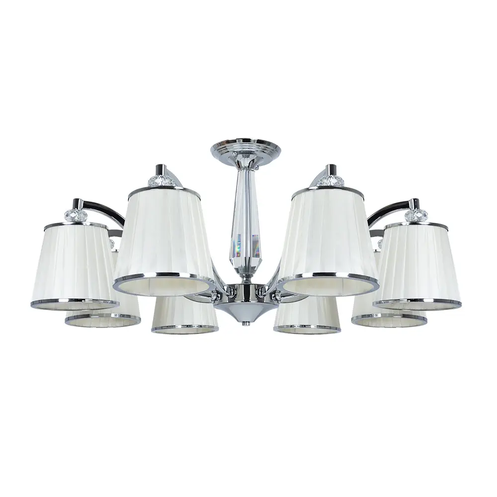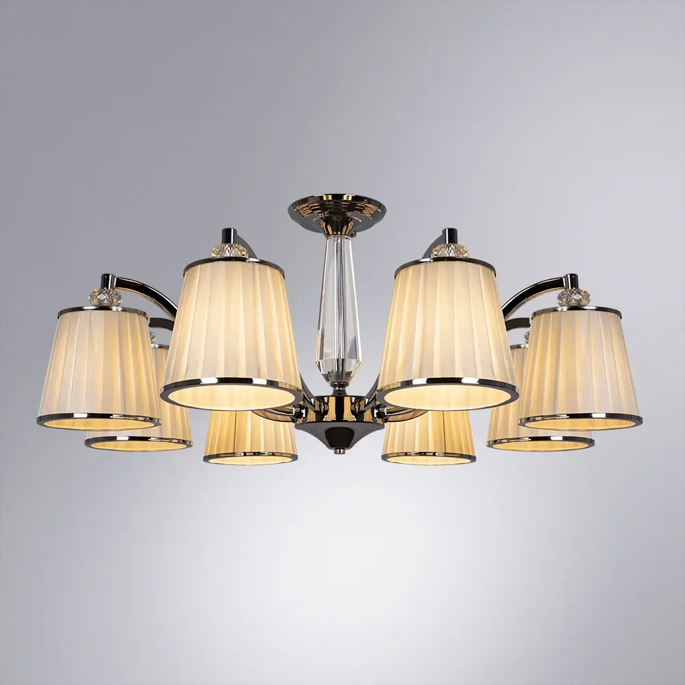 Потолочная люстра Arte Lamp A4047PL-8CC в стиле американской классики создаст элегантную и комфортную атмосферу в вашем интерьере. Модель с восемью текстильными плафонами белого цвета и элементами из хрусталя излучает мягкий рассеянный свет, направленный вниз. Прочная металлическая арматура хромированного оттенка гарантирует долговечность. Светильник предназначен для светодиодных ламп и монтируется на потолок при помощи скобы. Официальная гарантия на изделие составляет 36 месяцев.