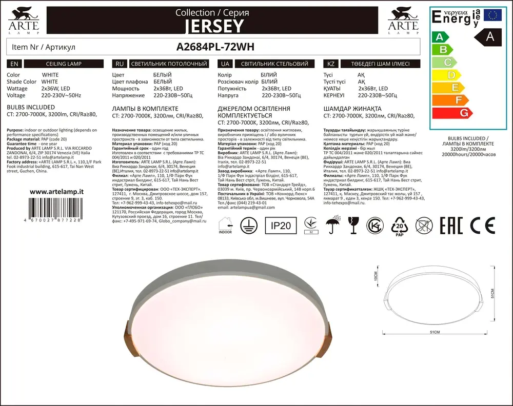Потолочный светильник Arte Lamp A2684PL-72WH создает равномерное заливающее освещение, идеальное для просторных помещений. Его конструкция из белого металла и матового акрила выглядит лаконично и соответствует современному стилю. Плафоны направлены вниз, обеспечивая комфортный свет без бликов. Модель использует энергоэффективные светодиодные лампы, а встроенный пульт ДУ позволяет регулировать освещение на расстоянии. Это практичное решение для гостиной, кухни или прихожей, где важен одновременно стильный внешний вид и функциональность.