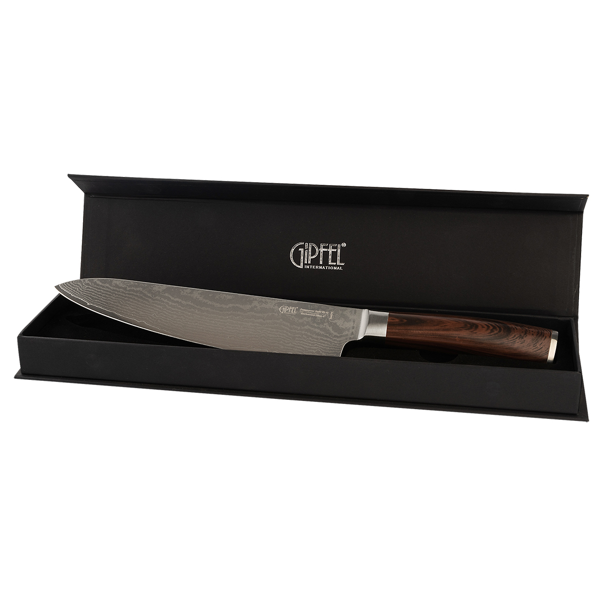 Нож поварской из дамасской стали GIPFEL 8487. Длина лезвия 21 см. Толщина лезвия 2,5 мм. Материал: 73-слойная японская нержавеющая сталь премиум класса VG-10.