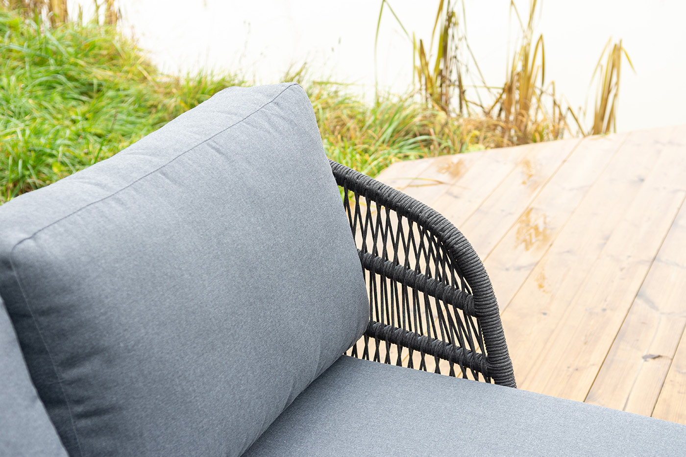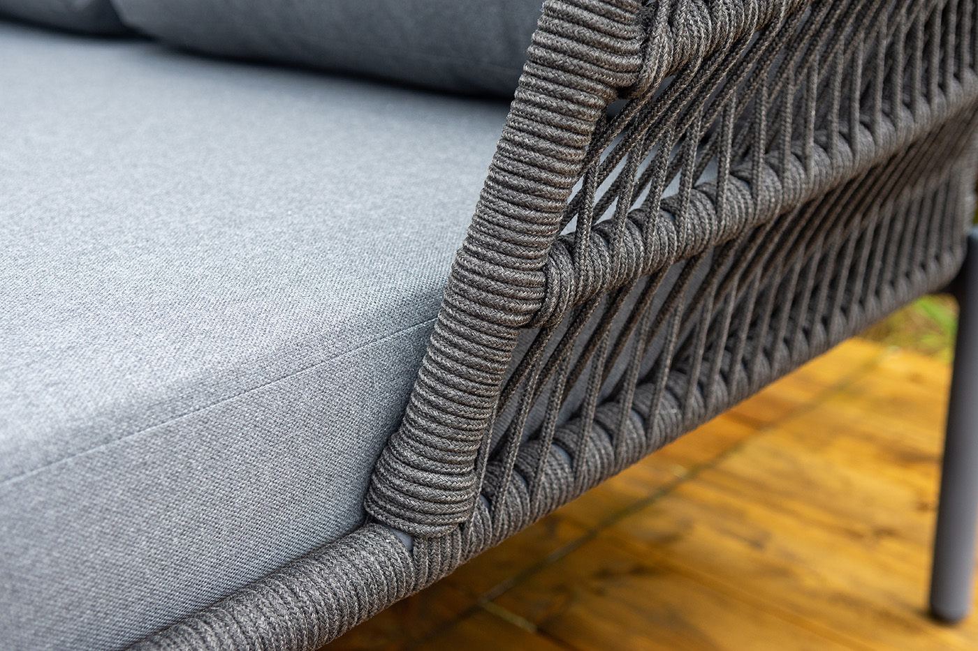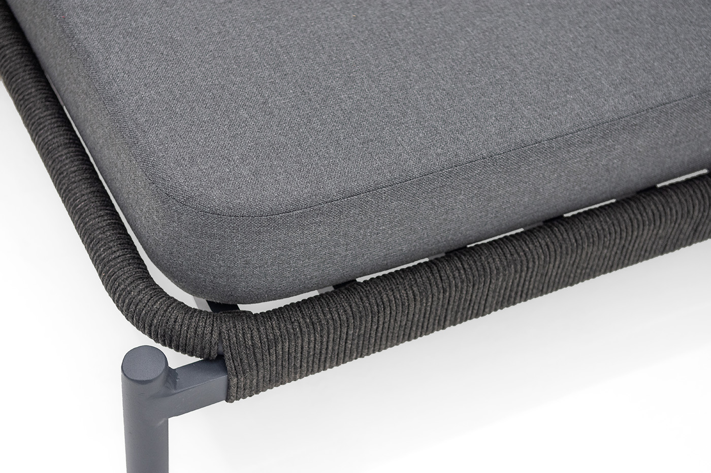 Оплетка боковин выполнена вручную из роупа — эластичных синтетических лент на основе высокопрочных полиэфирных волокон. Темно‑серый оттенок оплетки гармонично сочетается с каркасом, подчеркивая лаконичность дизайна.