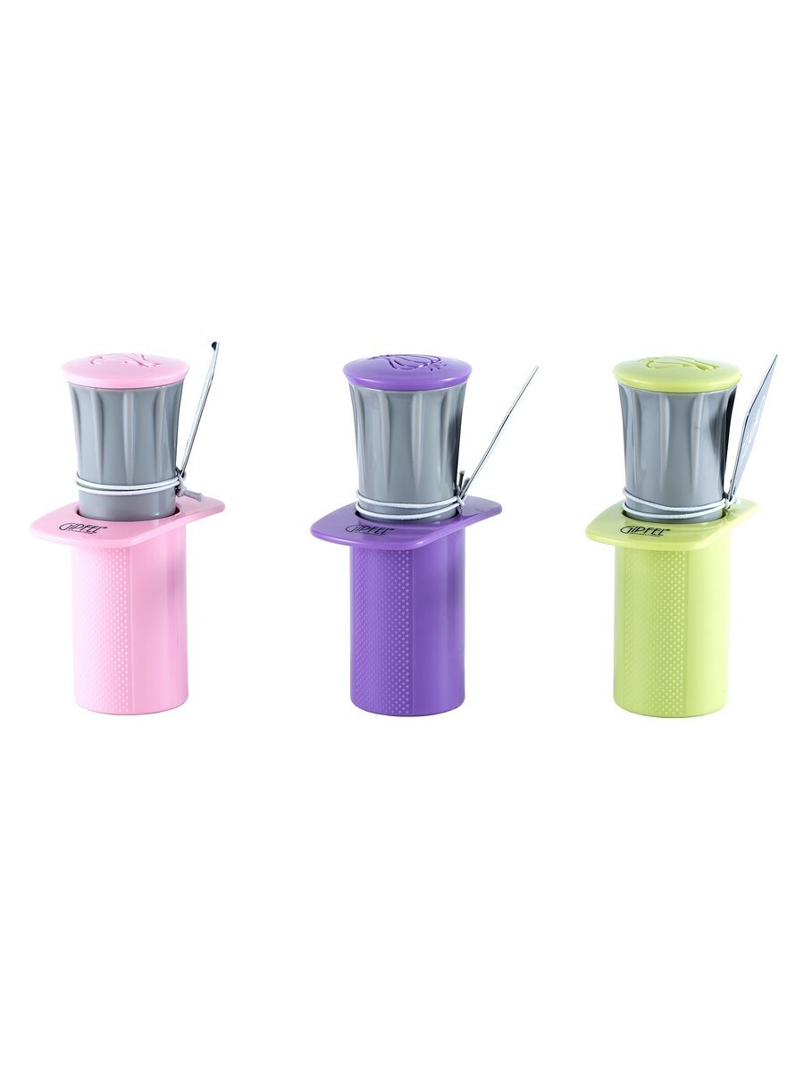 Пресс для чеснока GIPFEL 6344. Корпус сделан из пластика с металлической пластиной для измельчения чеснока. Принцип работы пресса очень прост: поршень вкручивается по резьбе, придавливая чесночные дольки к пластине с отверстиями. Высота пресса 11 см, ширина 3,5 см, диаметр нижней части 3,5 см.