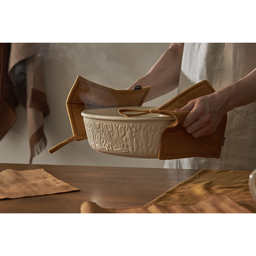 Прихватка цвета карри из коллекции Essential – универсальный кухонный аксессуар, который непременно пригодится во время приготовления пищи. Изделие выполнено из прочного, гипоаллергенного 100% хлопка. В качестве наполнителя используется плотный полиэстер. Благодаря такому сочетанию материалов прихватка не нагревается даже при длительном контакте с горячими поверхностями. Предусмотрена специальная петелька для подвешивания.