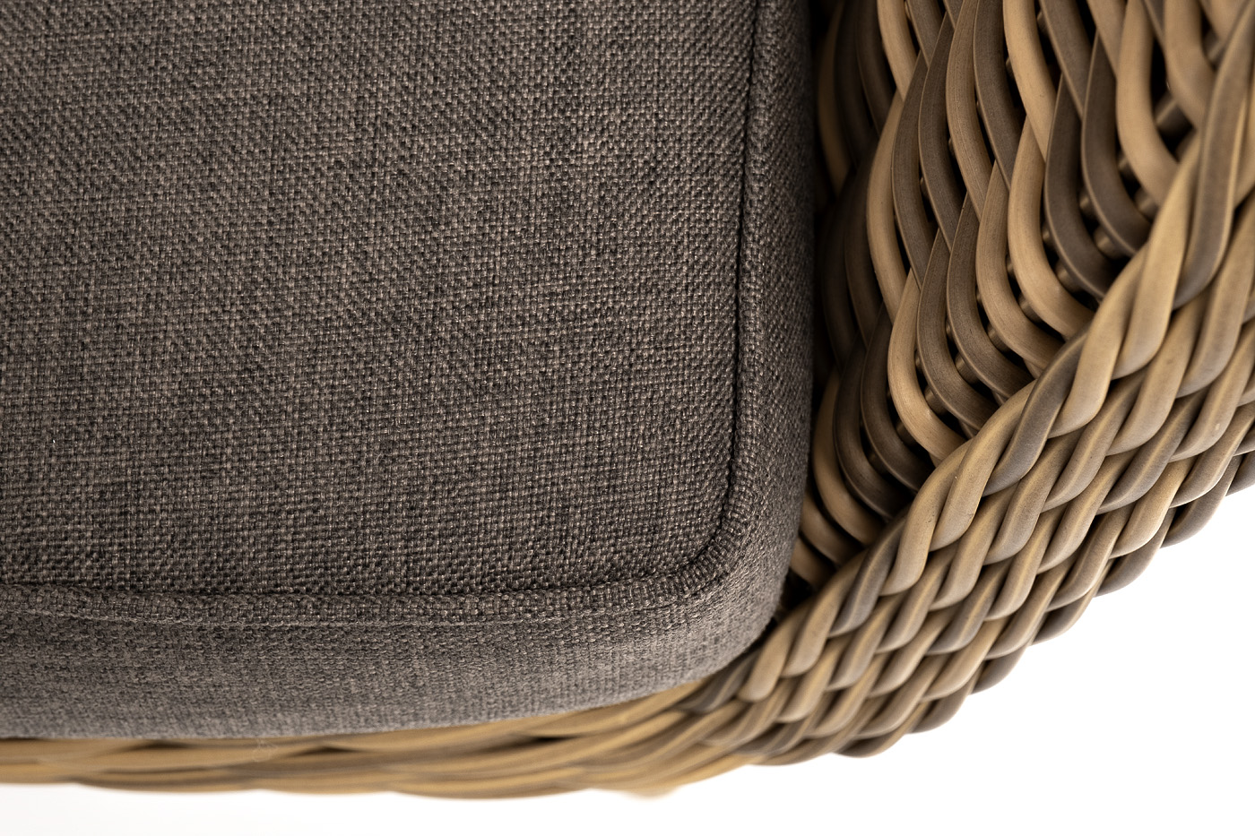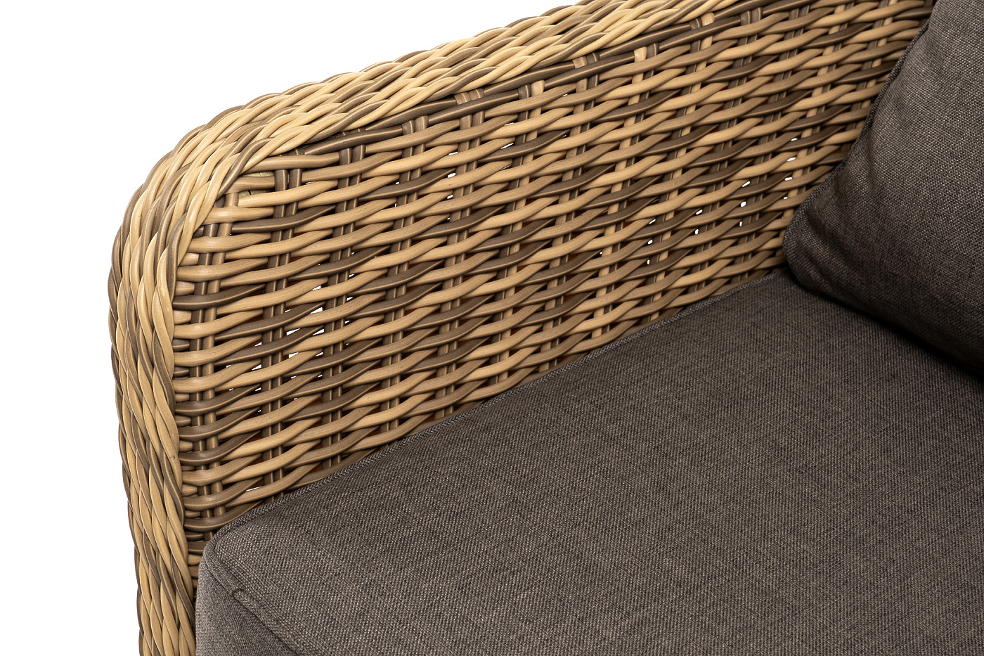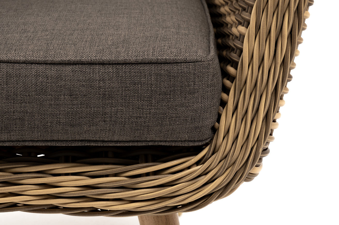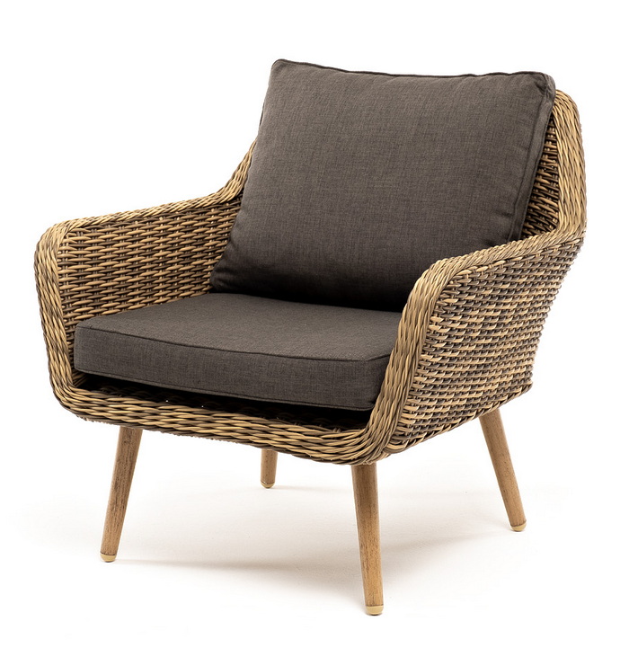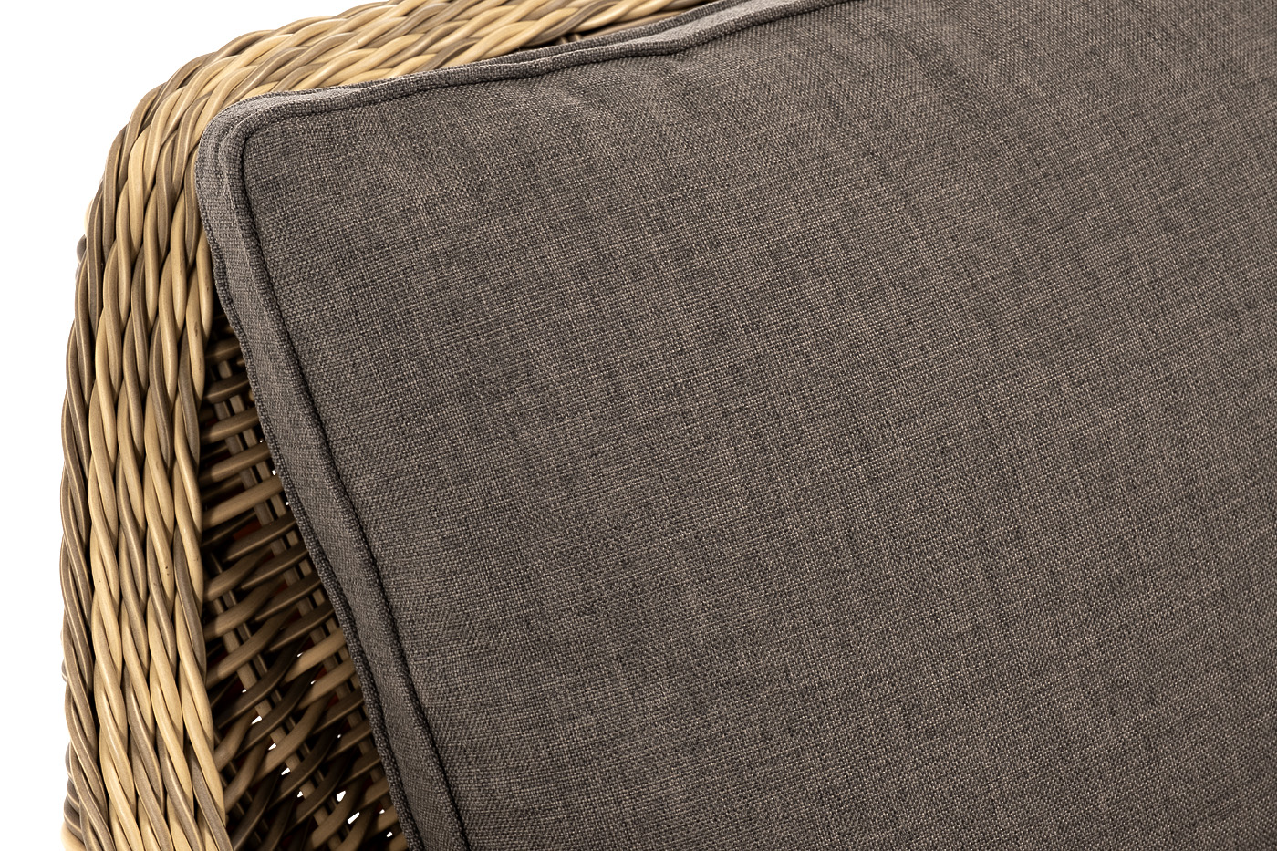 В комплекте с уличным ротанговым креслом идут мягкие подушки со съёмными чехлами серого оттенка. Они пошиты из полиэстера, который не боится повышенной влажности благодаря наличию влагоотталкивающей пропитки. Плотность ткани составляет 300гр/м2.