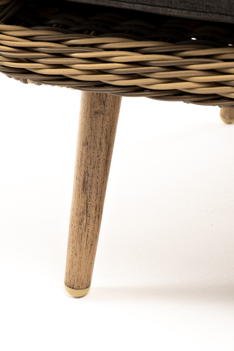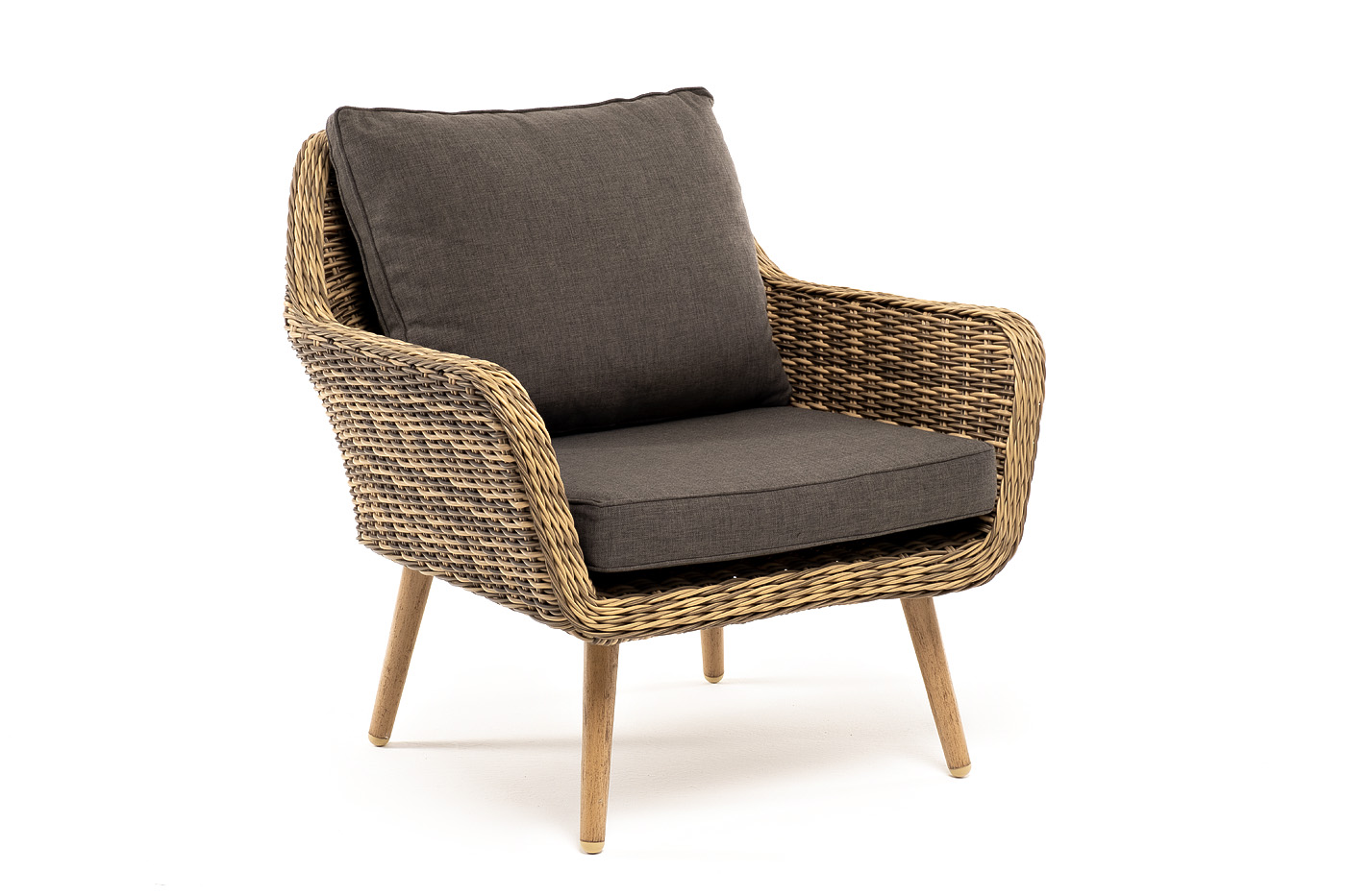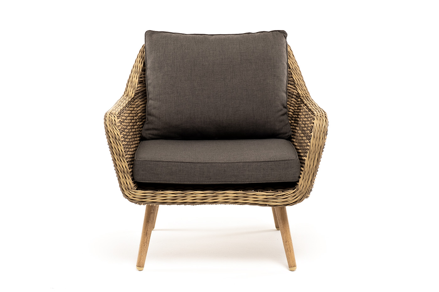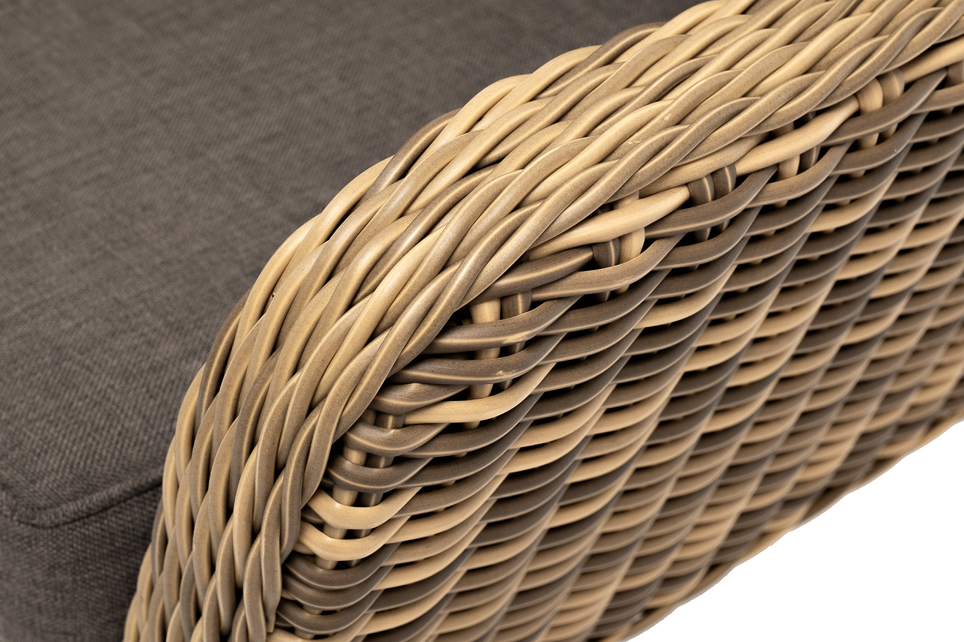В комплекте с уличным ротанговым креслом идут мягкие подушки со съёмными чехлами серого оттенка. Они пошиты из полиэстера, который не боится повышенной влажности благодаря наличию влагоотталкивающей пропитки. Плотность ткани составляет 300гр/м2.