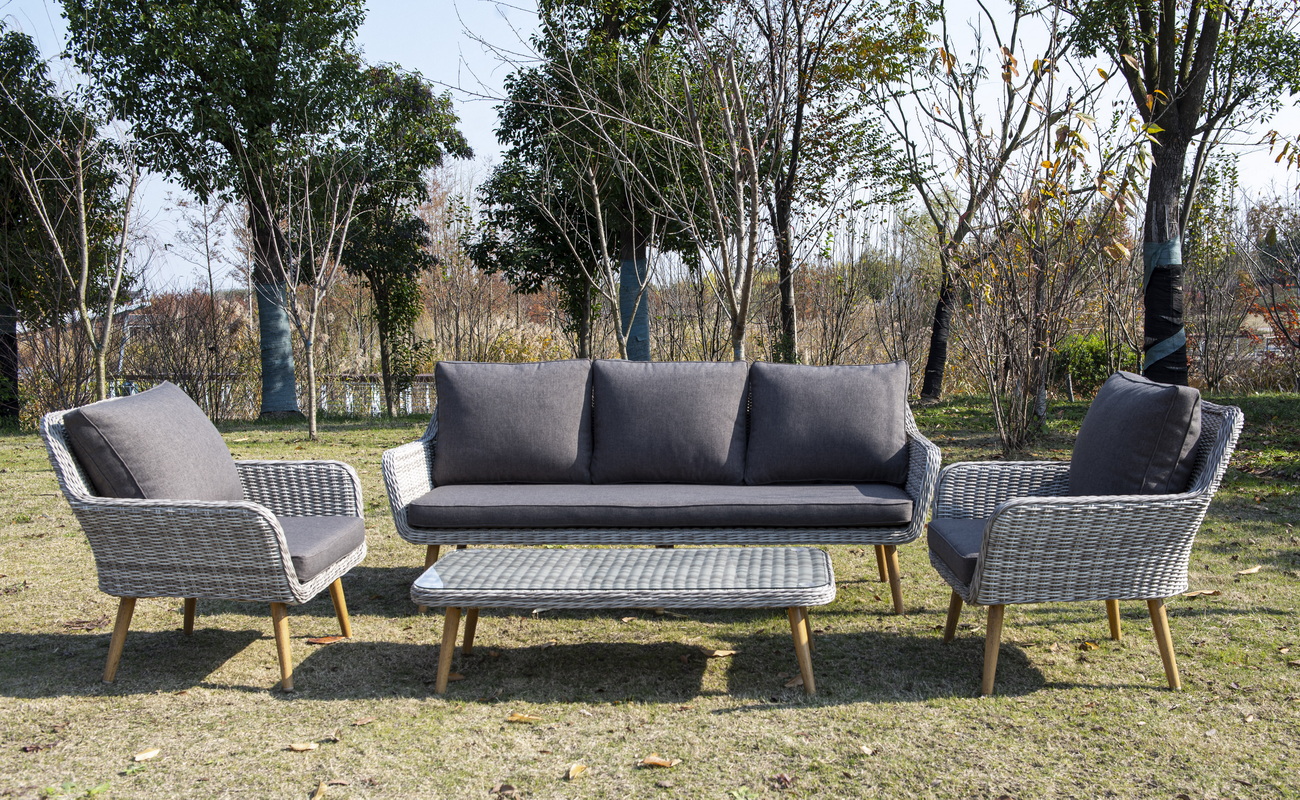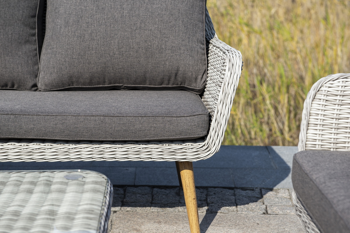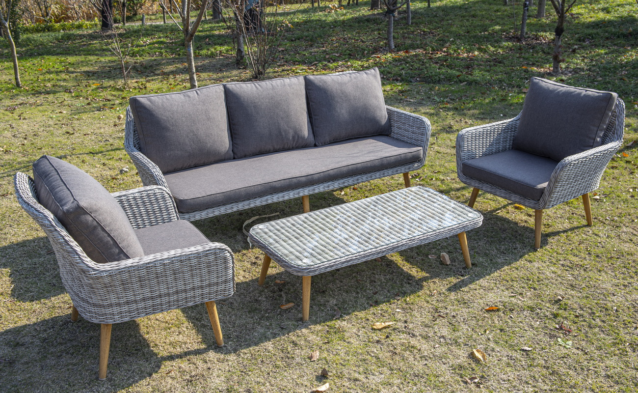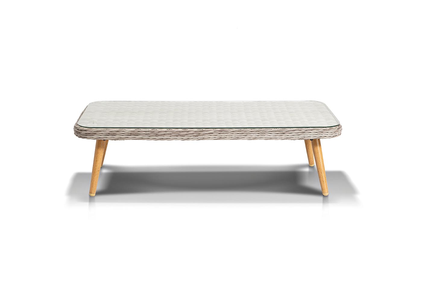 Столешницу из ротангового плетения дополняет прочное стекло, используемое для изготовления мебели. Стекло крепится с помощью держателей на силиконовых присосках и транспортируется в собранном виде.