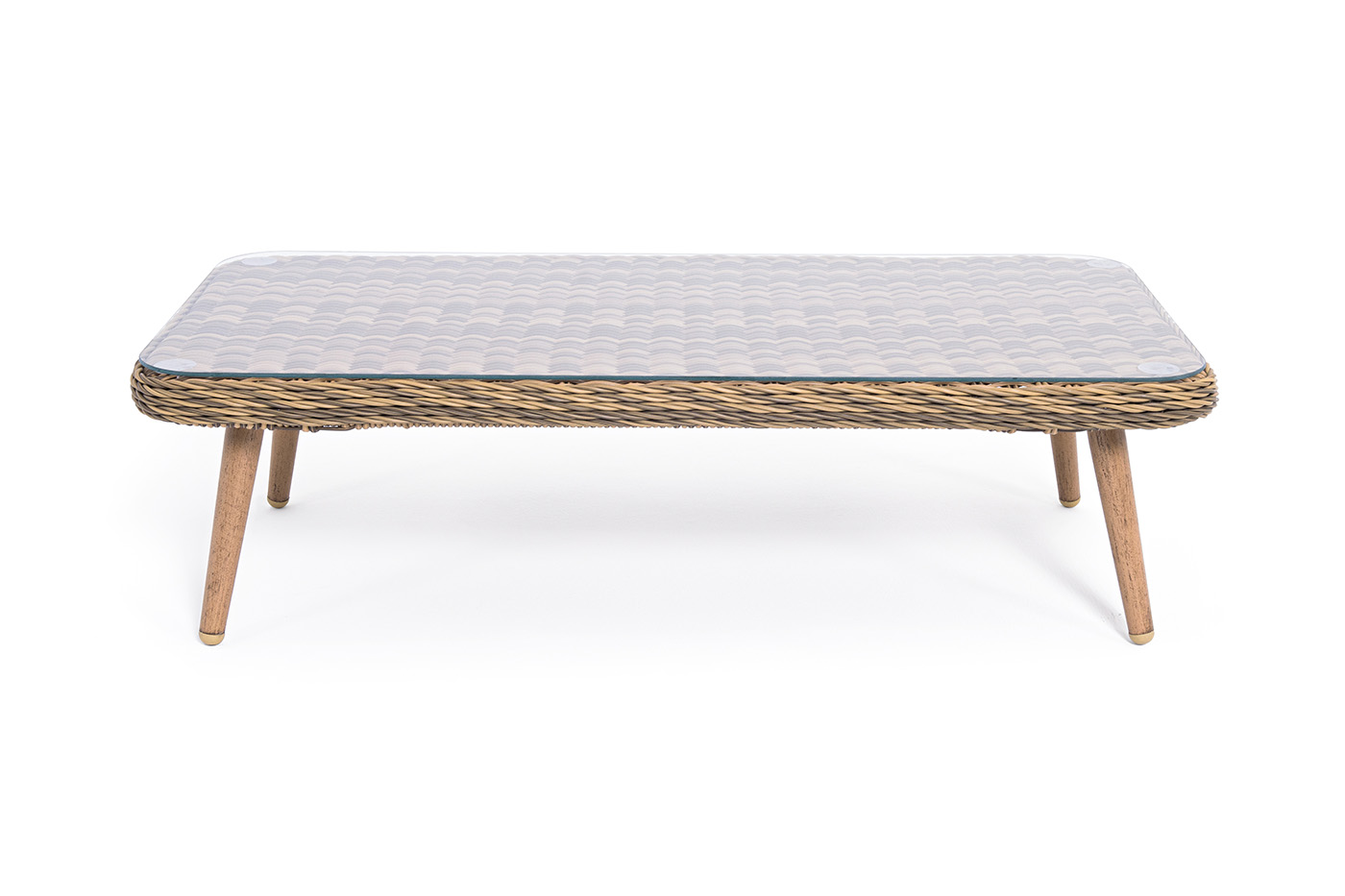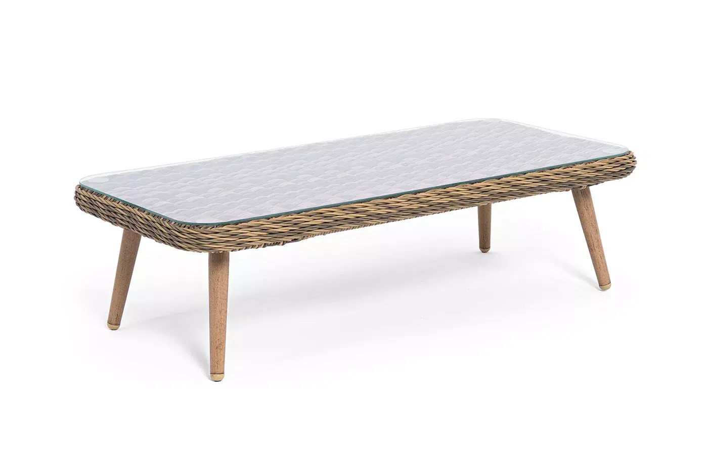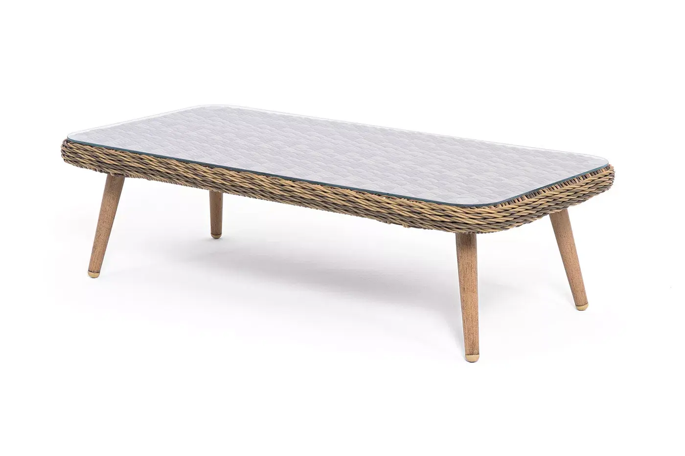 Столешницу из ротангового плетения дополняет прочное стекло, используемое для изготовления мебели. Стекло крепится с помощью держателей на силиконовых присосках и транспортируется в собранном виде.