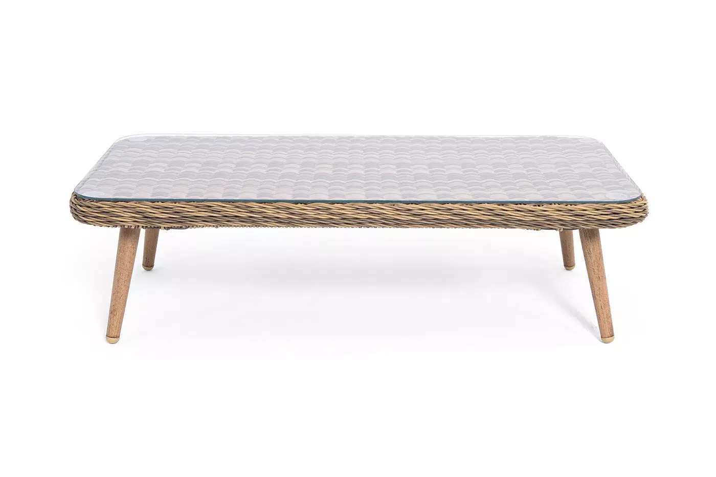 Алюминиевый каркас имеет цвет натурального дерева. Столик дополняет декоративная оплетка, при изготовлении которой используется круглый искусственный ротанг. Она представлена в соломенном цвете.