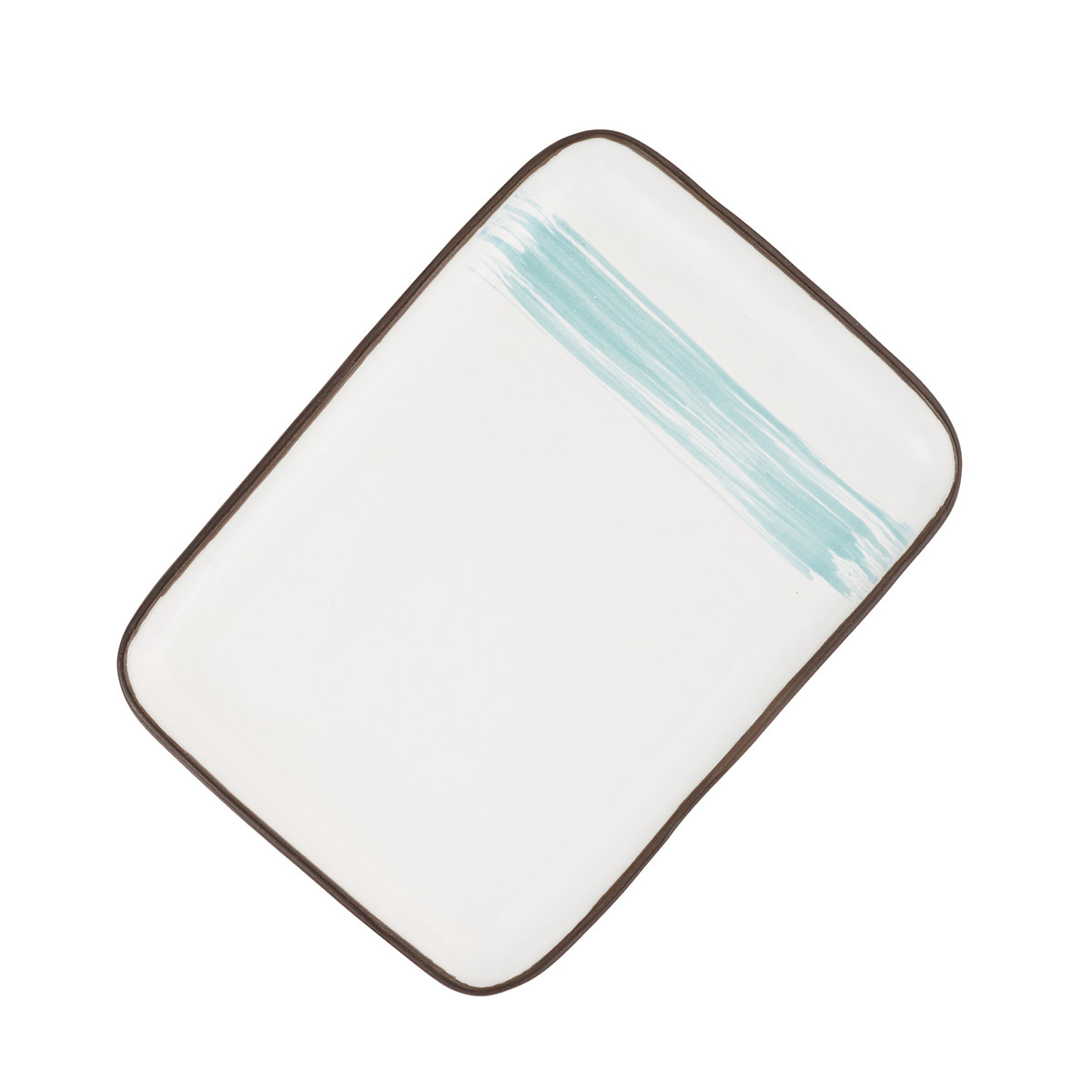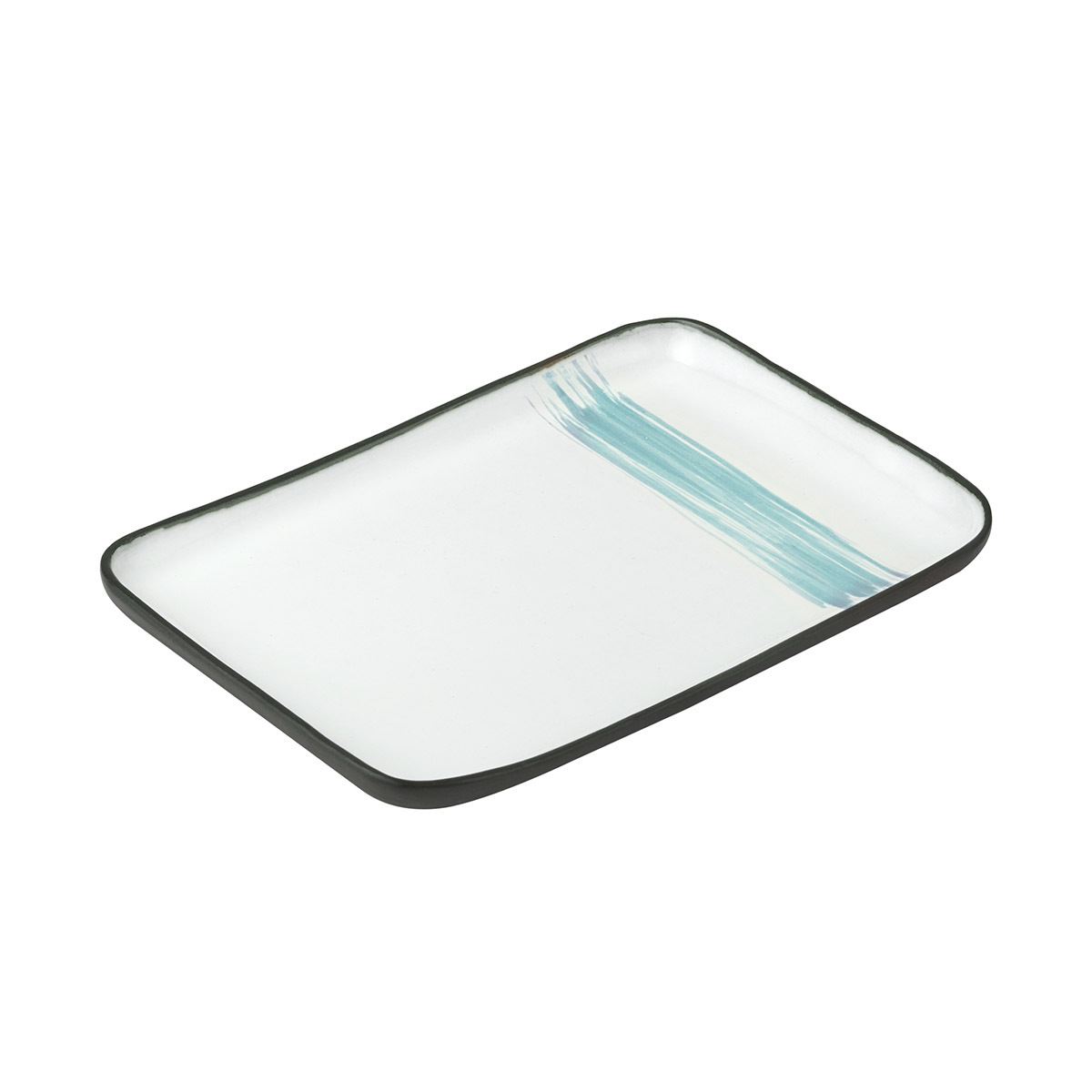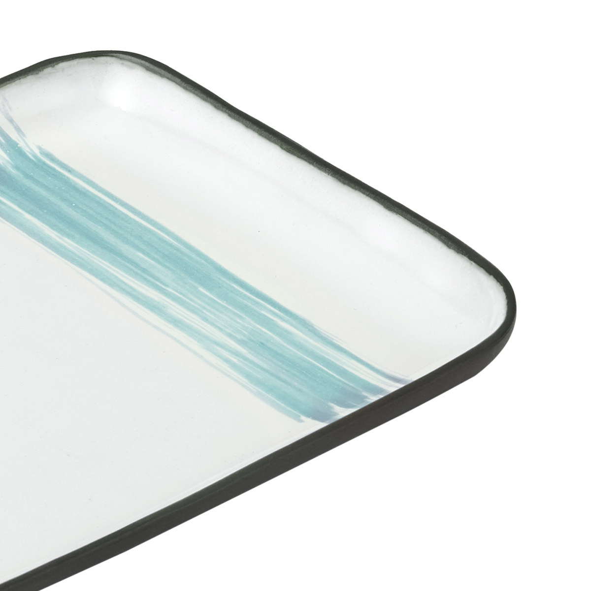 Вся серия керамической посуды Iceland изготовлена и глазурована вручную, что гарантирует высочайшее качество посуды. Отличительной чертой серии является голубая полоса на общем белом фоне тарелок. Эта модель имеет прямоугольную форму, ее длина составляет 29 см, а ширина - 20 см.