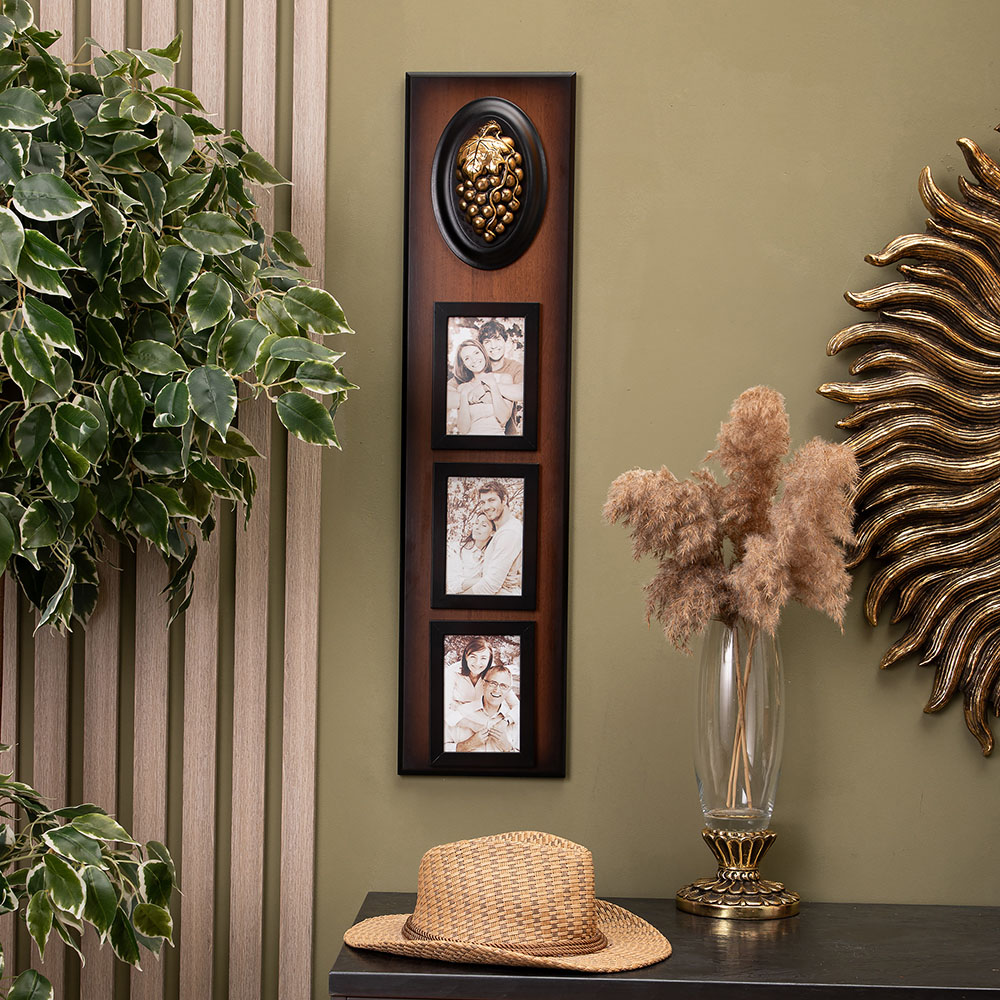 Рамка для трех фотографий (10х15 см) на магнитах, декорированная фигурой с изображением винограда. Виноград — один из самых древних солнечных символов плодородия, изобилия и богатства. Фотография защищена тонким прозрачным пластиком от пыли и других внешних воздействий. Изделие отличается прочной конструкцией и прослужит не один год! Материалы изготовления и размеры изделияИзделие изготовлено из Мдф. Поверхность тонирована, патинирована и покрыта лаком. Скульптурный элемент выполнен из высококачественного коелгинского мрамора, который привозится в виде мраморной крошки, затем отливается вручную и подвергается дополнительной обработке — патинированию и золочению поталью.