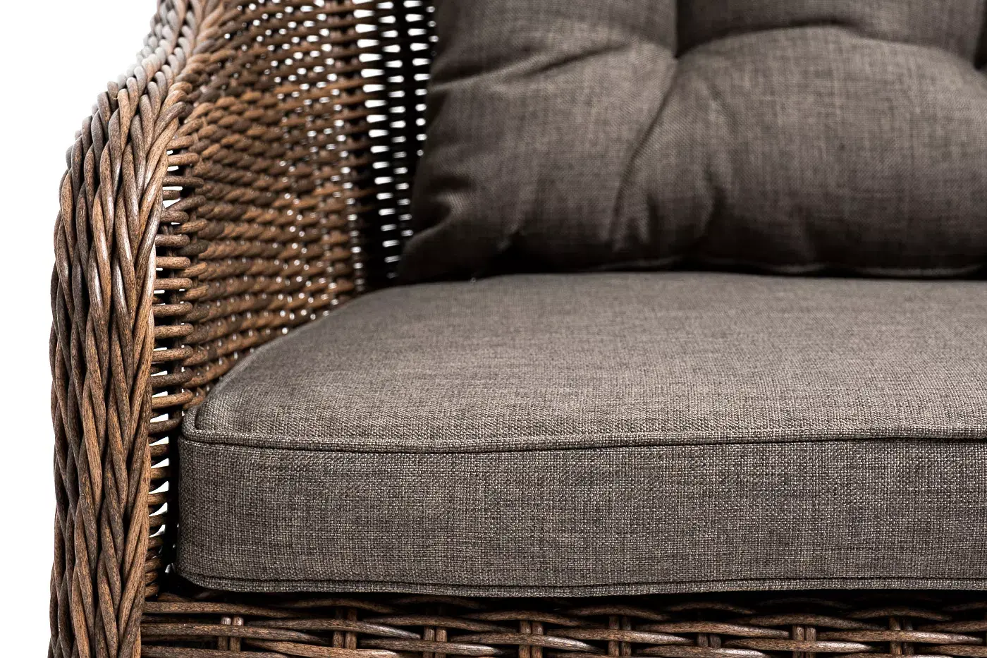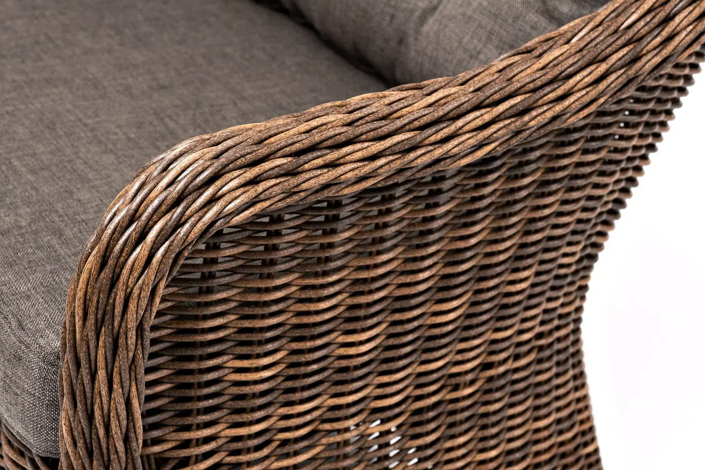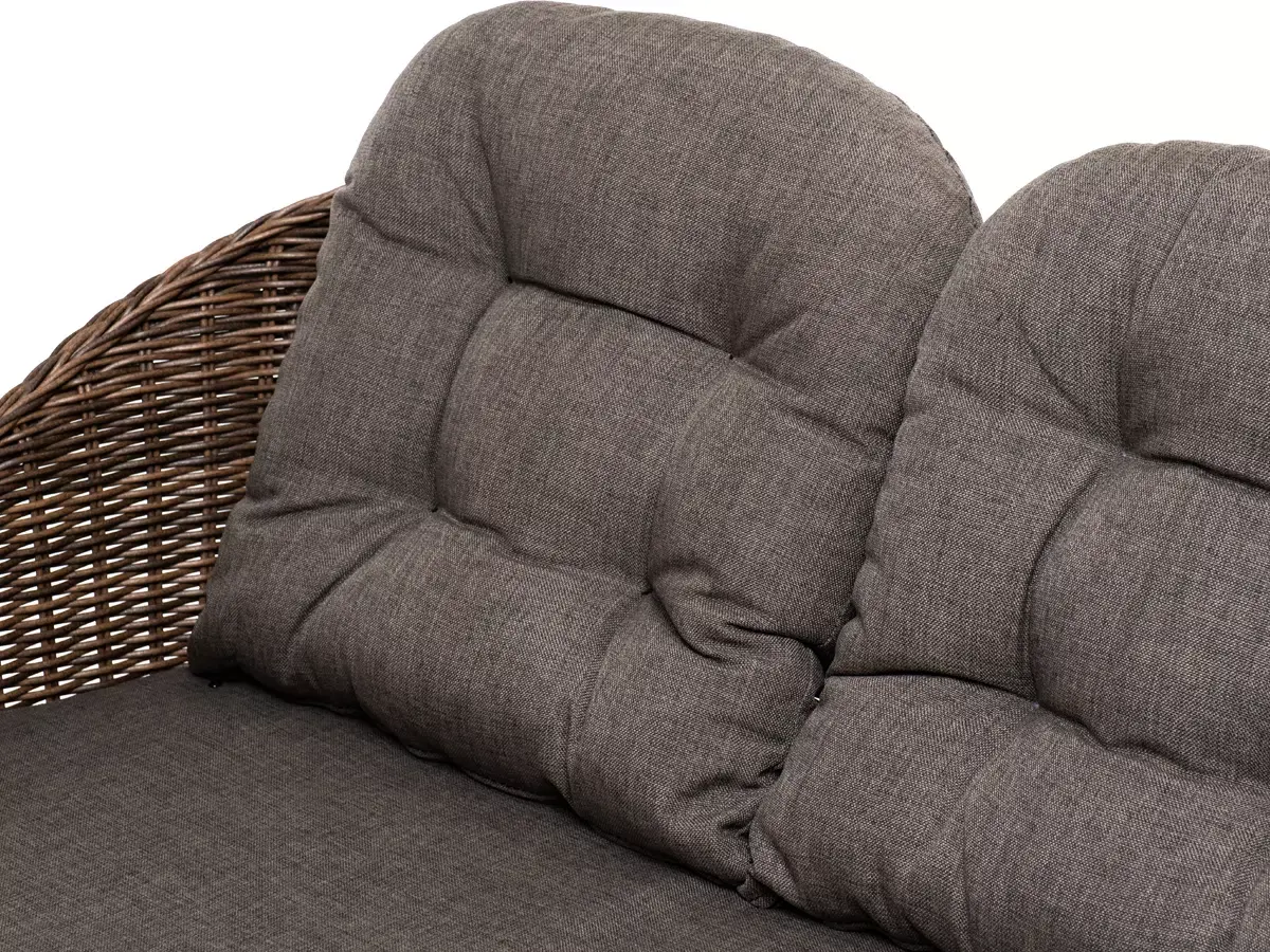 Диван выполнен из круглого искусственного ротанга, в основе алюминиевый каркас. Цвет коричневый.