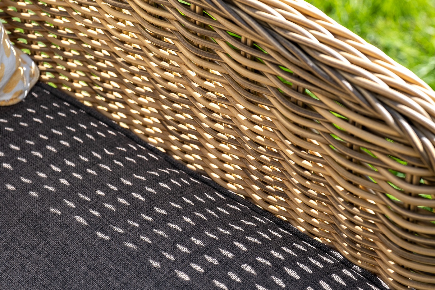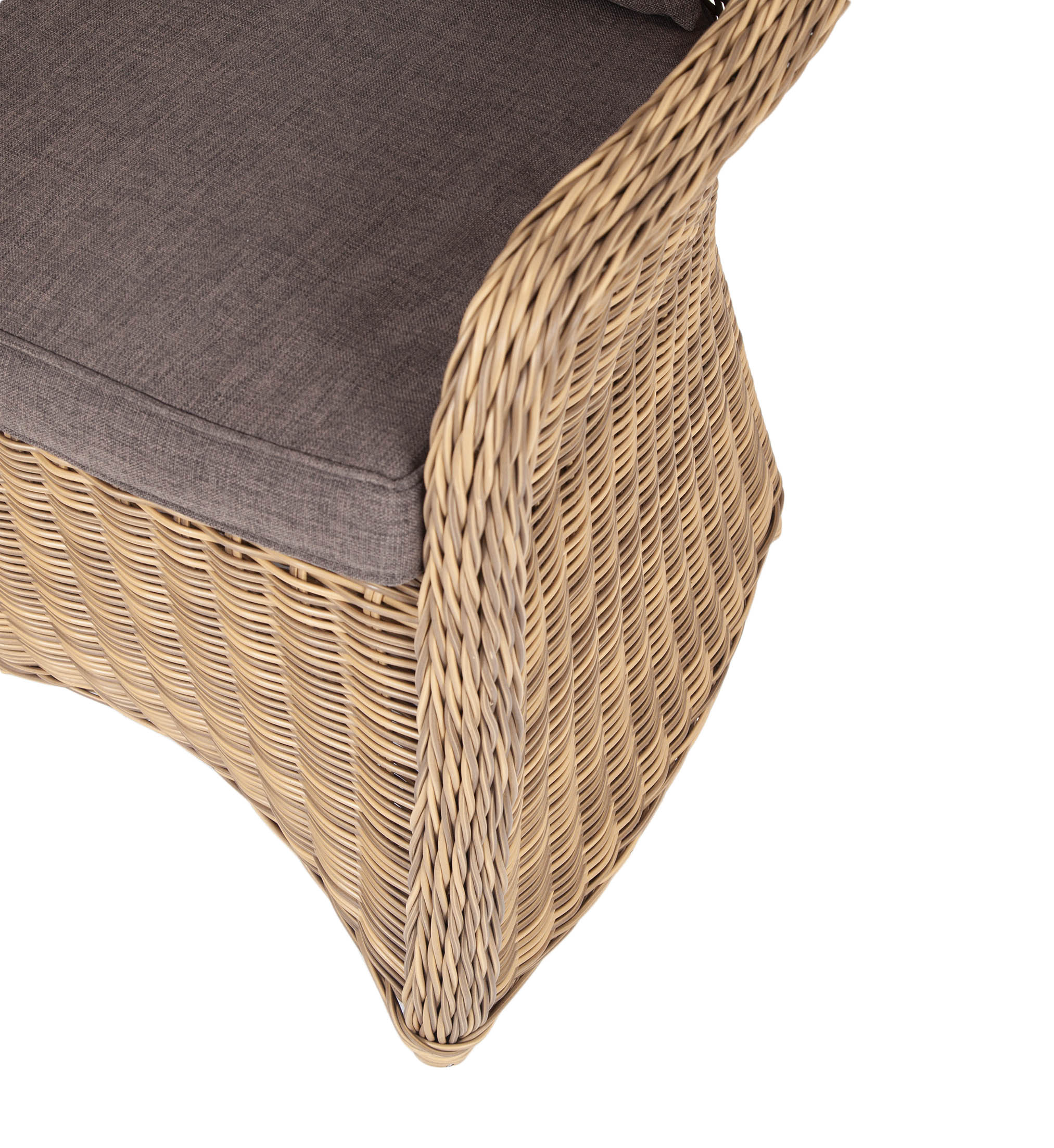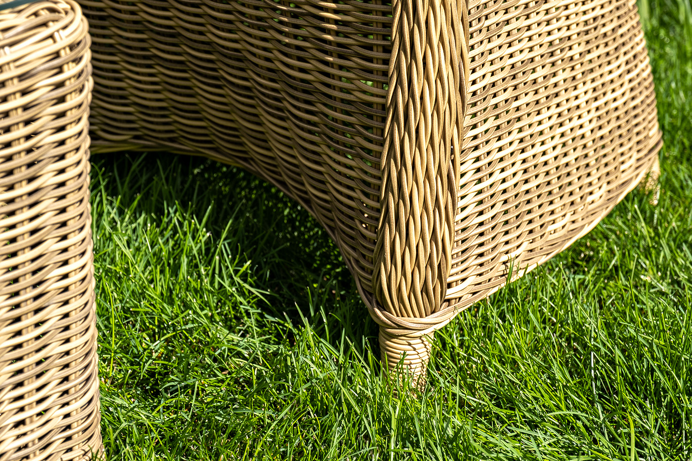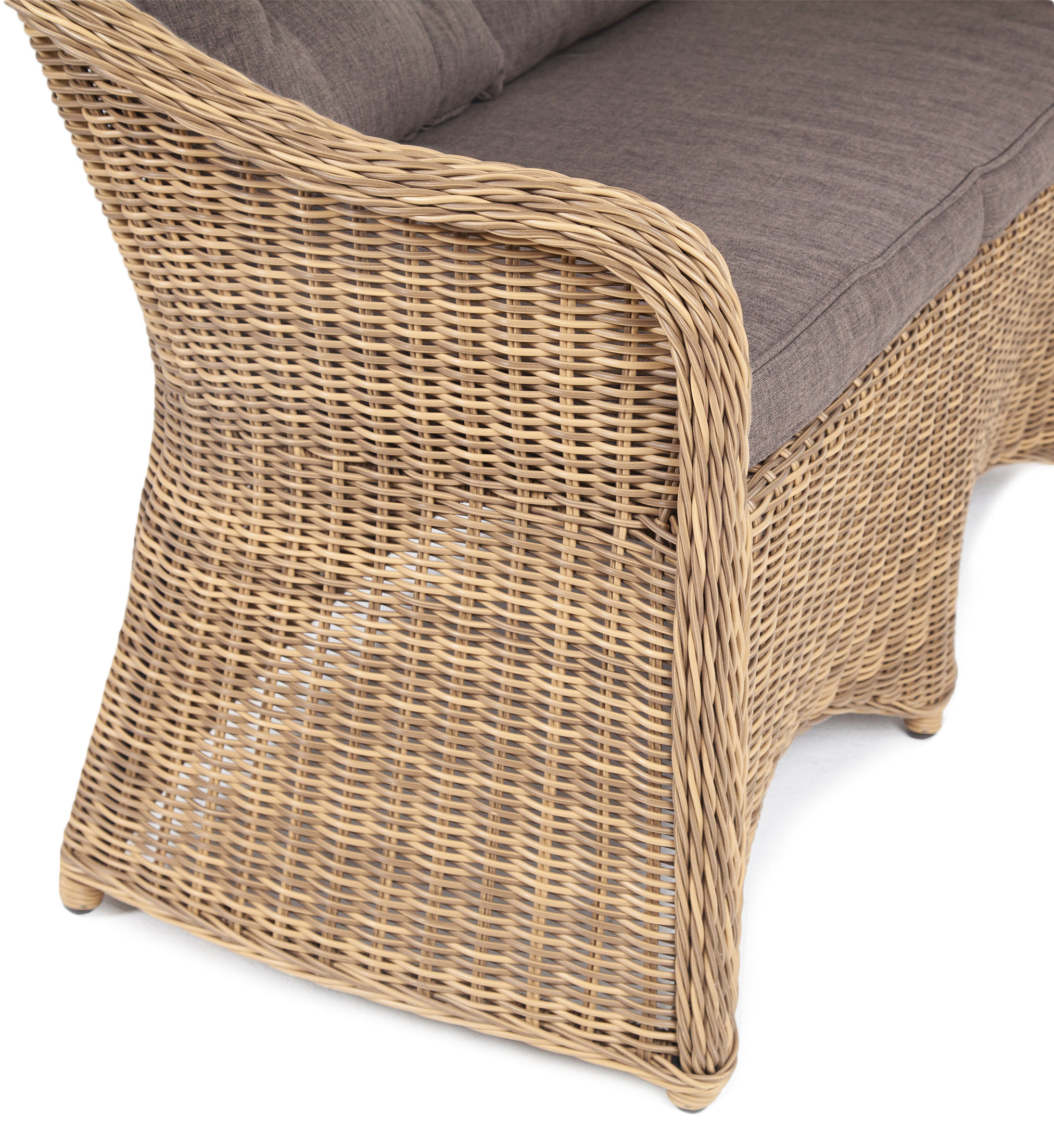 Диван выполнен из круглого искусственного ротанга, в основе алюминиевый каркас. Цвет соломенный.