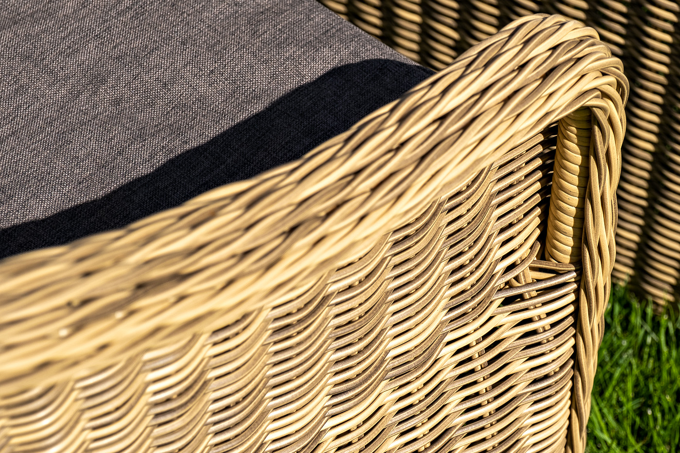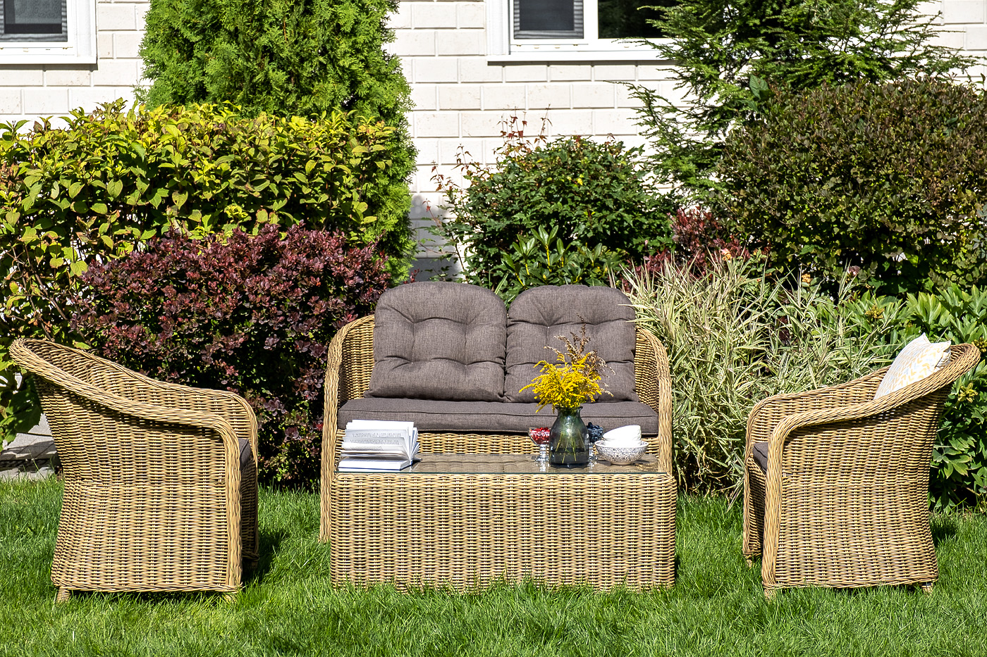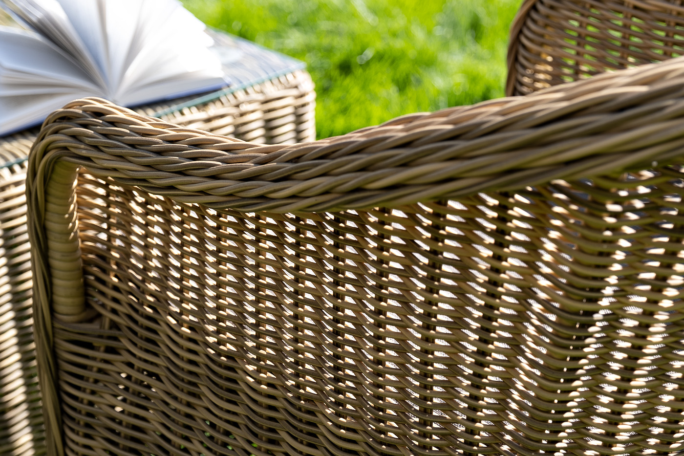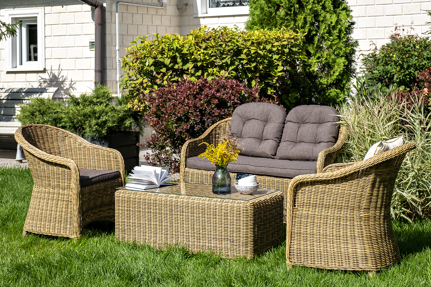 Диван выполнен из круглого искусственного ротанга, в основе алюминиевый каркас. Цвет соломенный.
