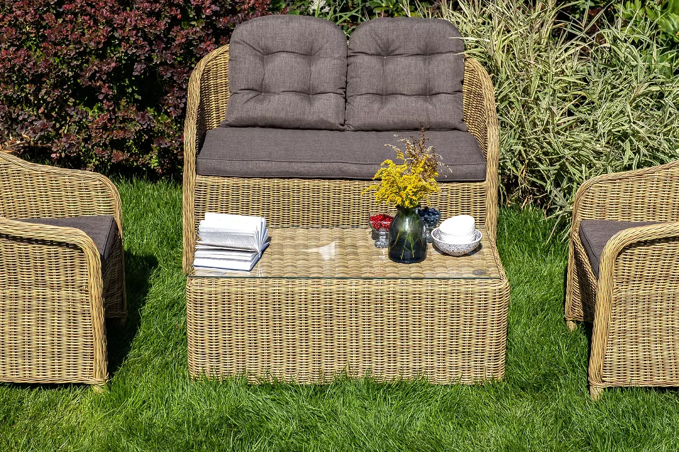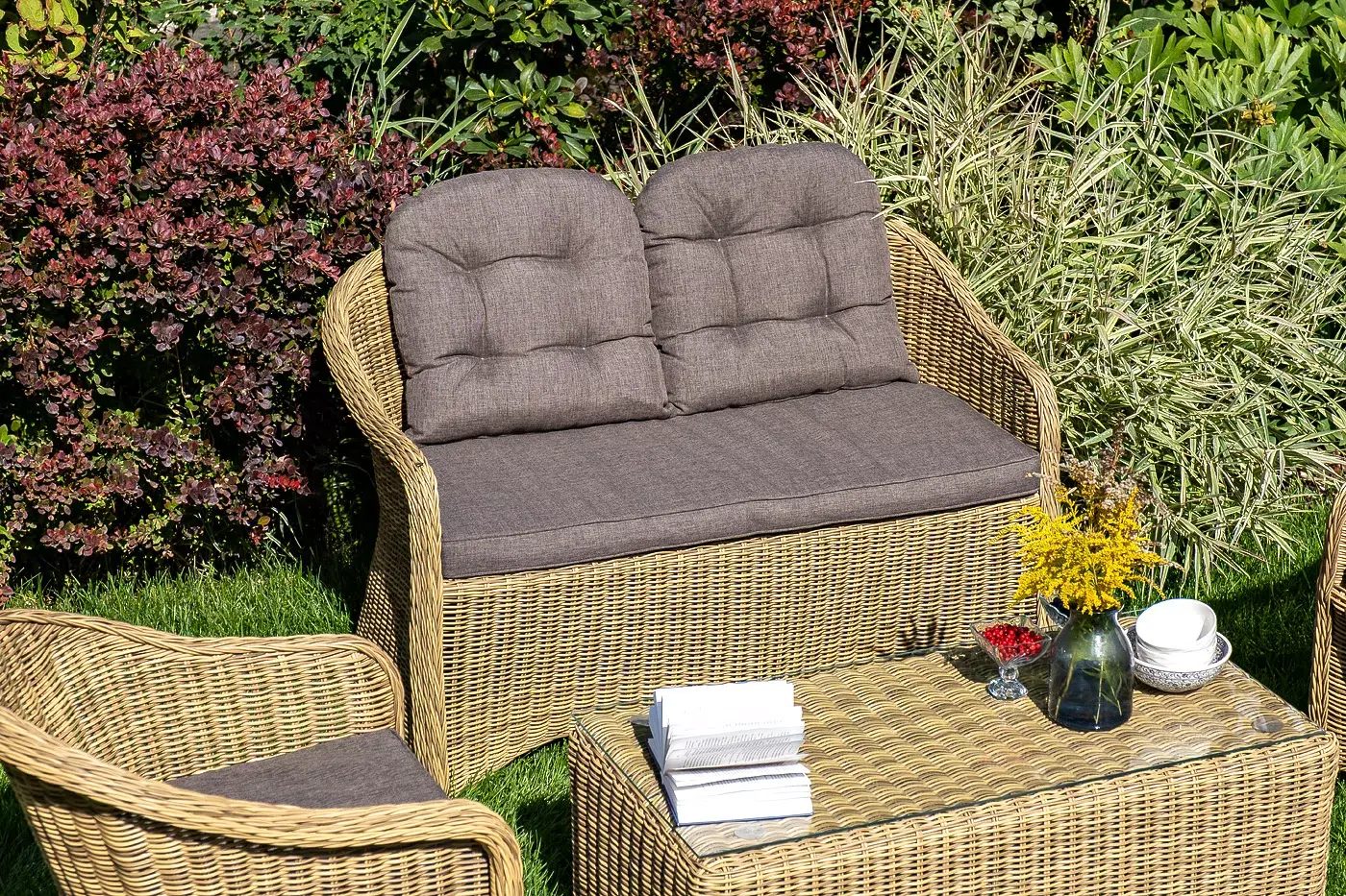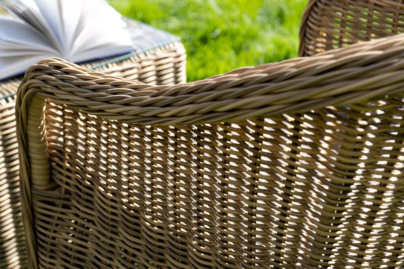 Комплект выполнен из круглого искусственного ротанга соломенного цвета. Каркас - из легкого и прочного алюминия. Подушки со съёмными чехлами - из 100% полиэстера, плотностью 300гр/м2 с влагоотталкивающей пропиткой.