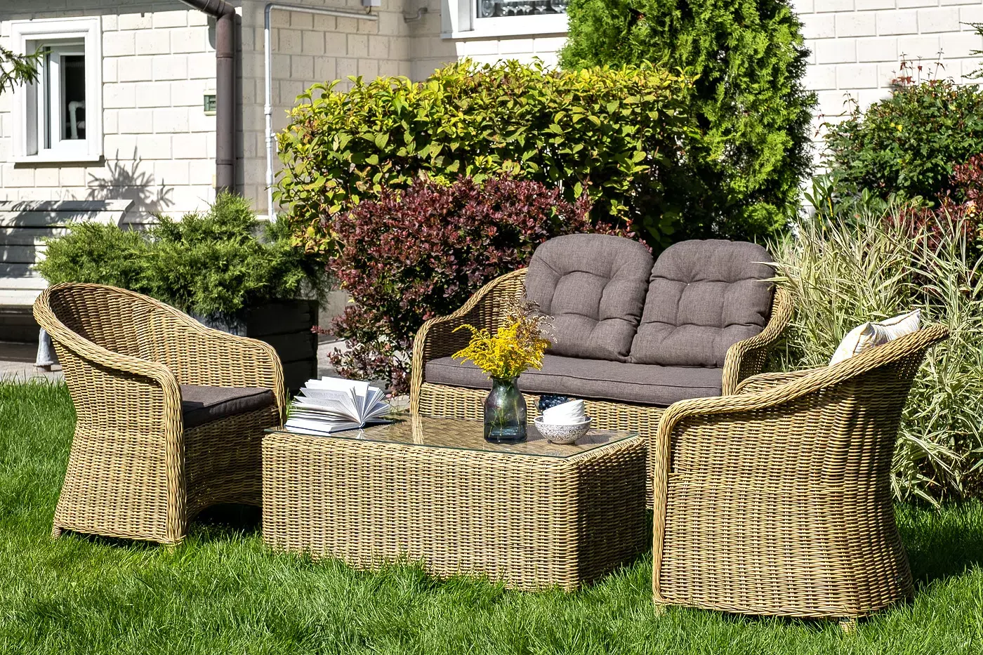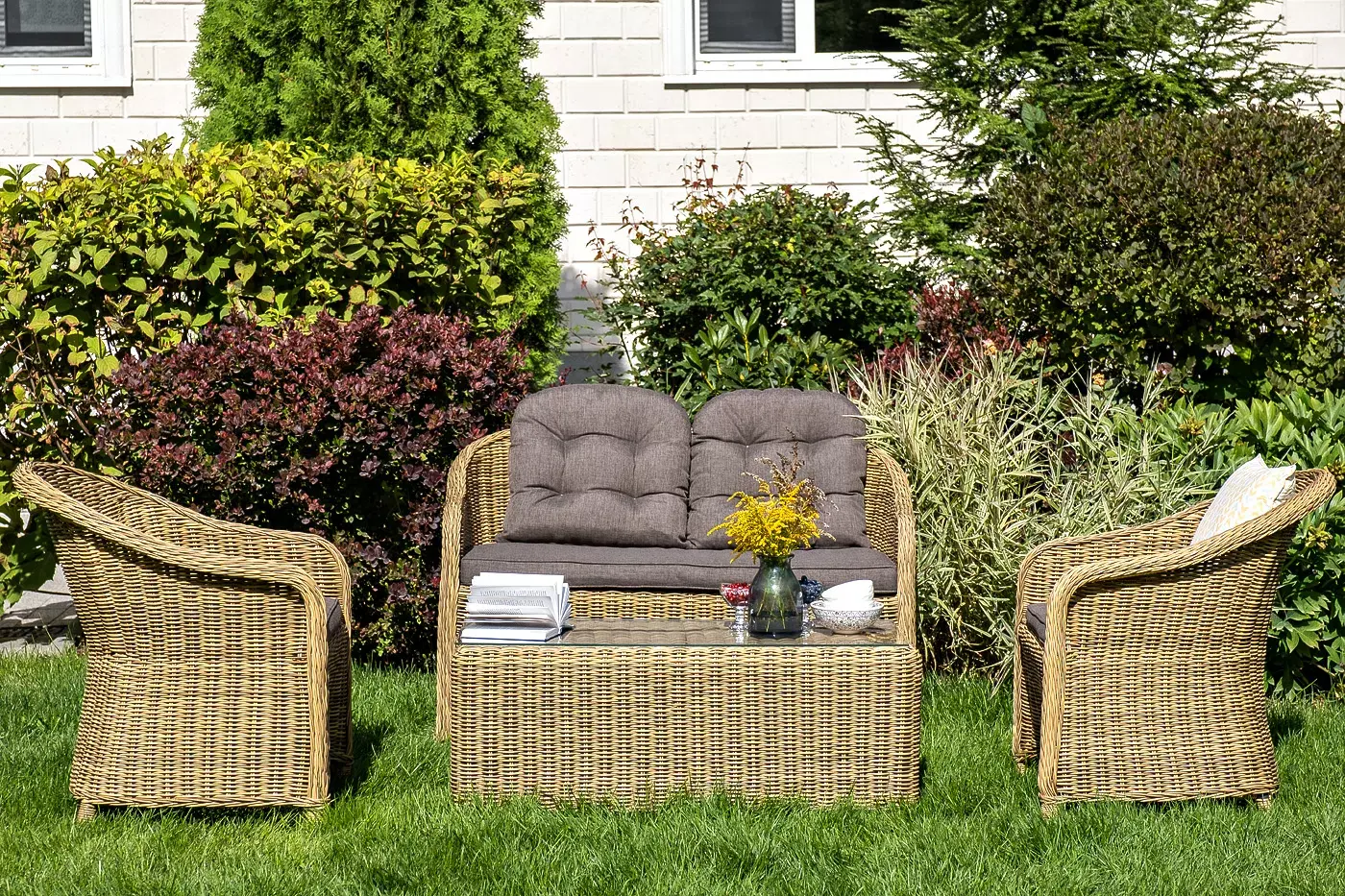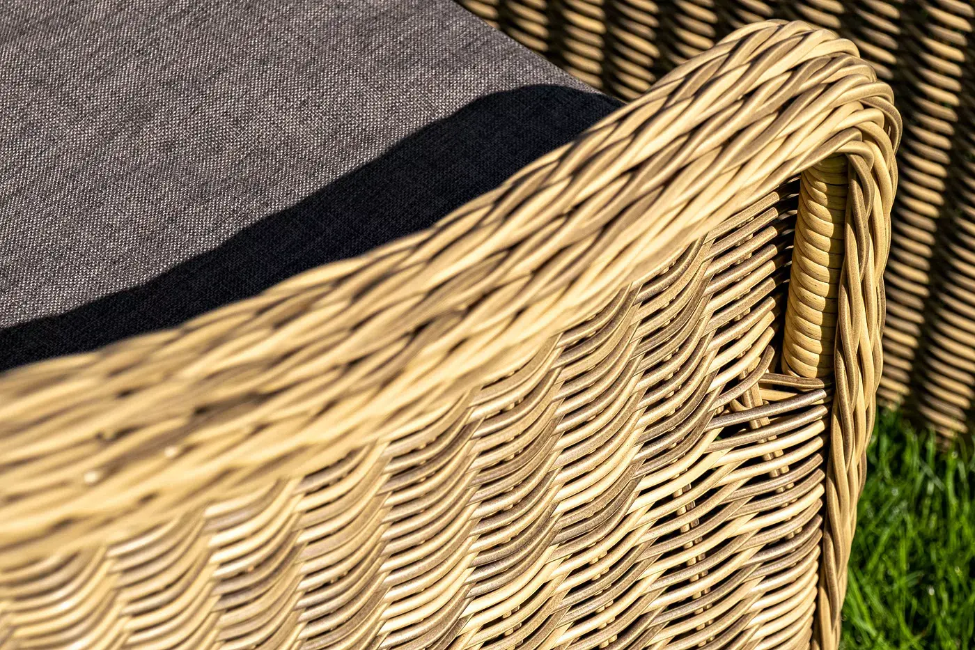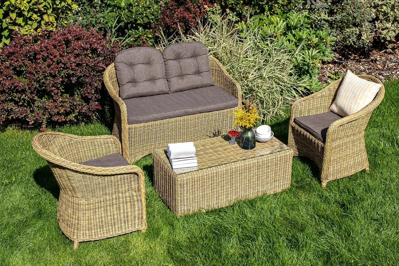 Комплект выполнен из круглого искусственного ротанга соломенного цвета. Каркас - из легкого и прочного алюминия. Подушки со съёмными чехлами - из 100% полиэстера, плотностью 300гр/м2 с влагоотталкивающей пропиткой.
