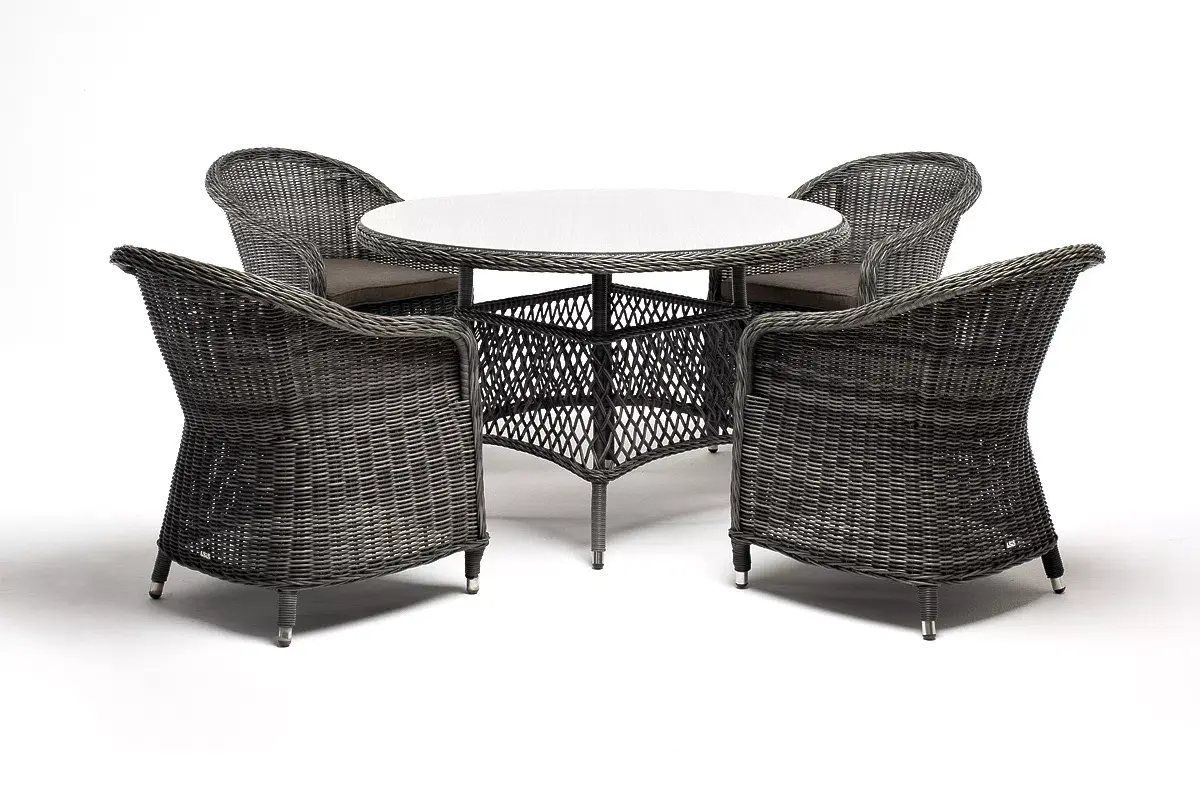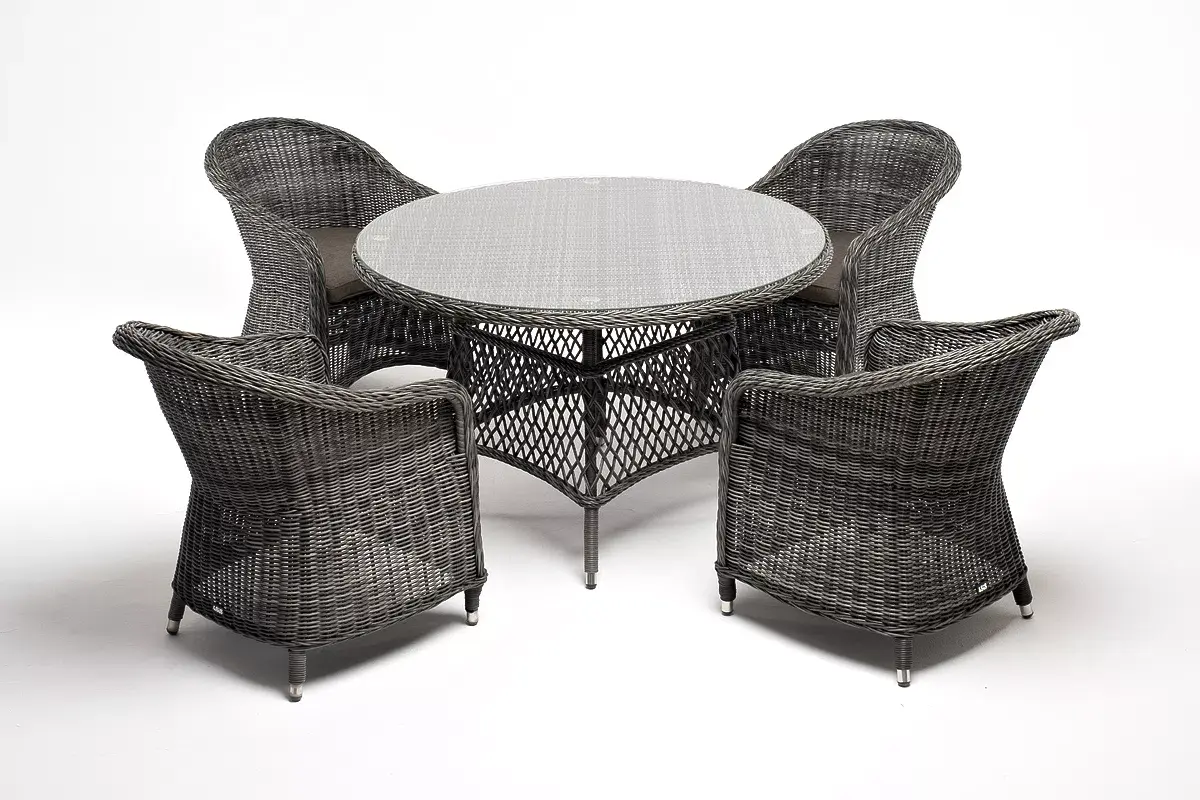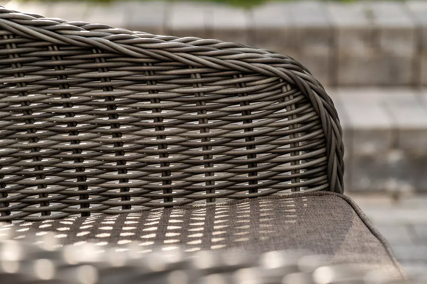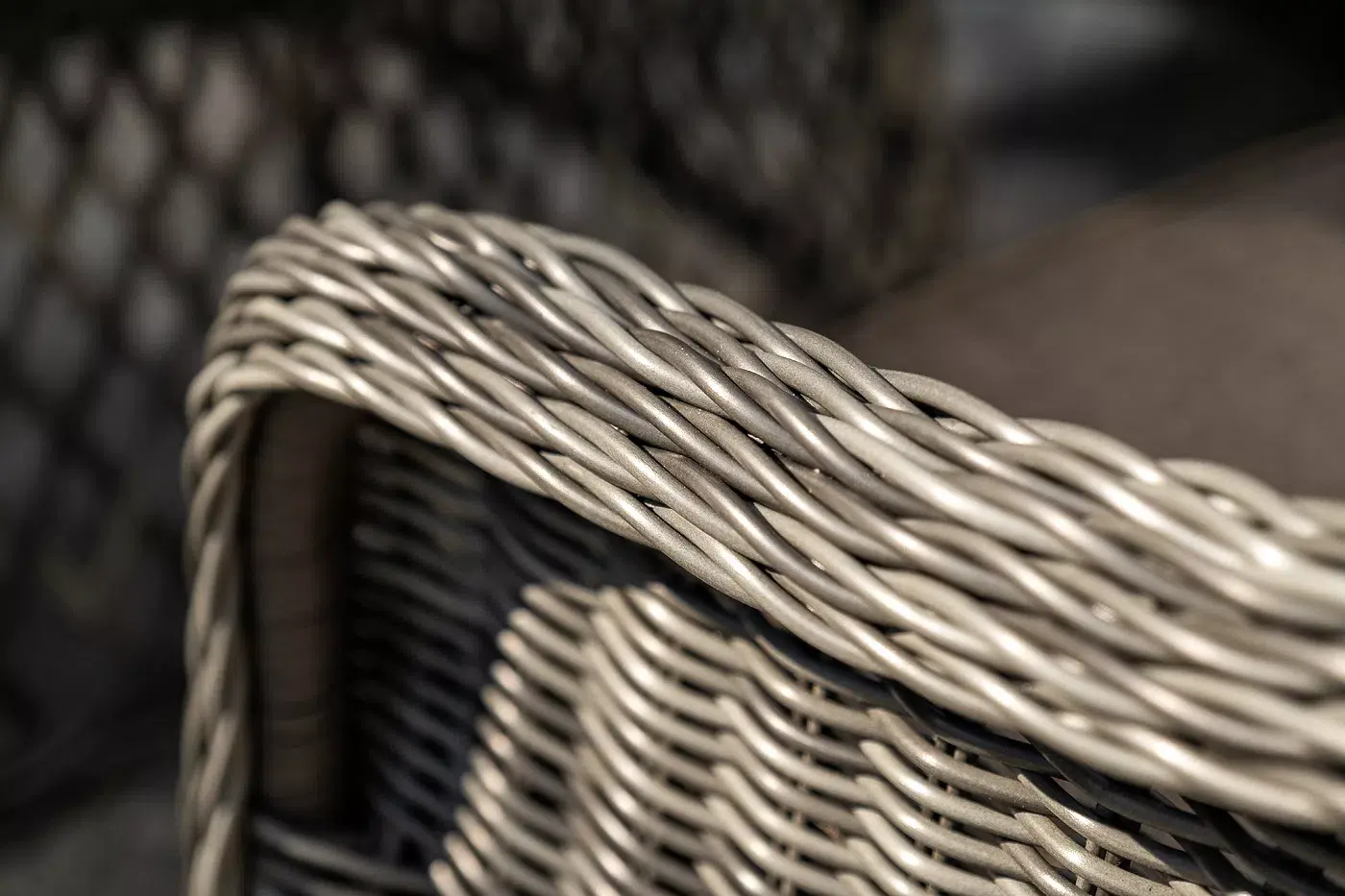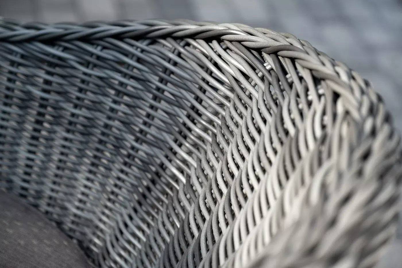 Вся мебель изготовлена из алюминия, поэтому ее очень легко перемещать. Декоративное покрытие выполнено из долговечного искусственного ротанга, устойчивого к перепадам температур и переменам погоды. Столешница изготовлена из прочного закаленного стекла 5 мм, кресла укомплектованы подушками серого цвета со съёмными чехлами.