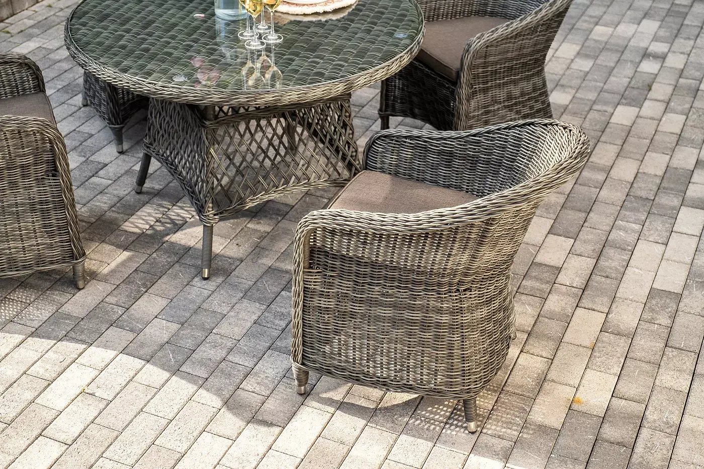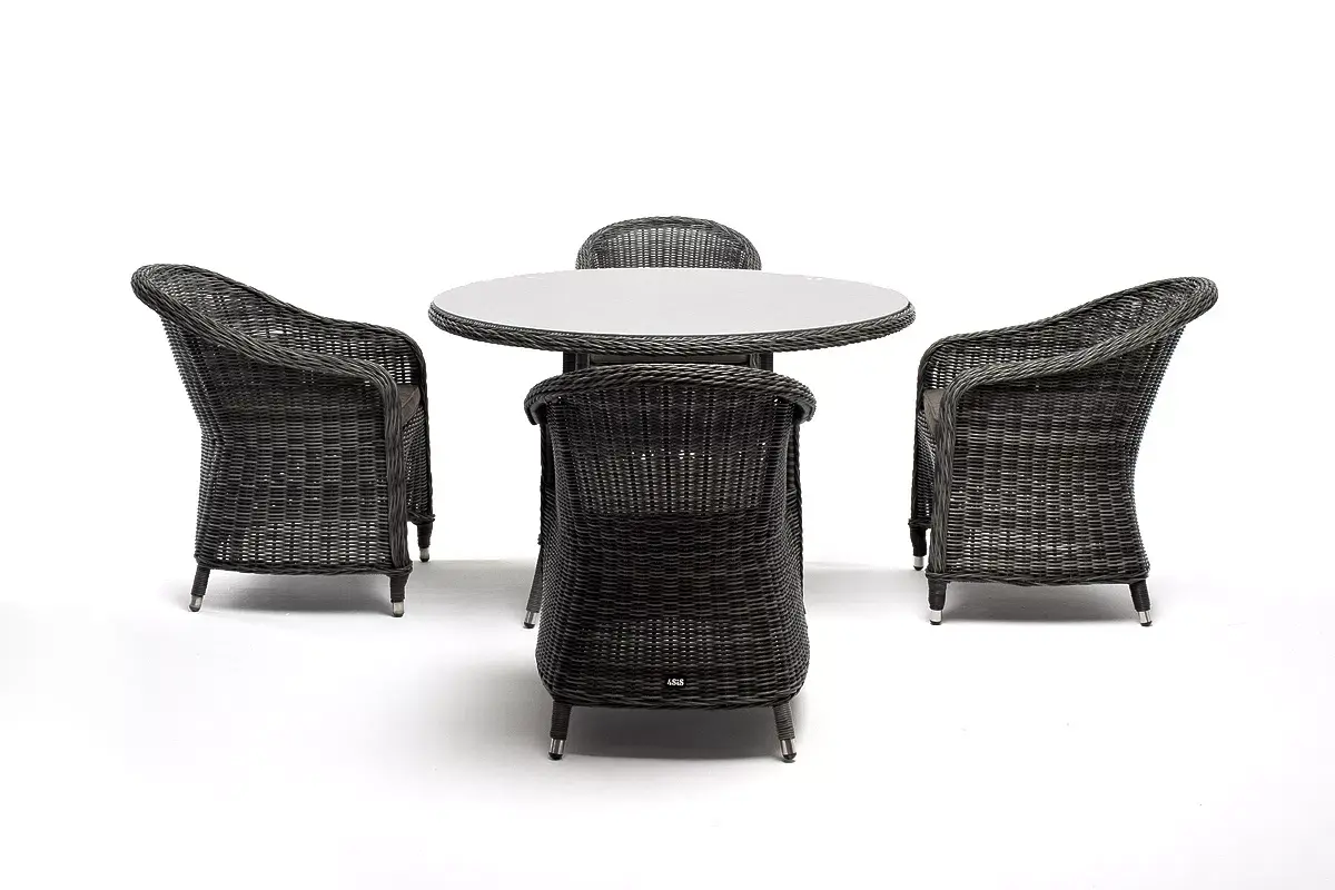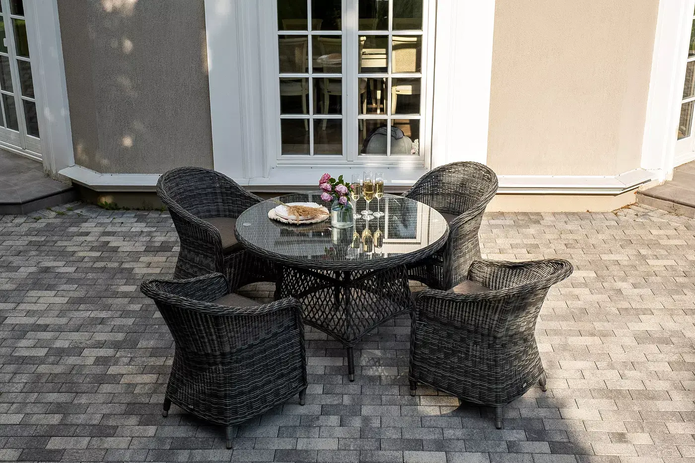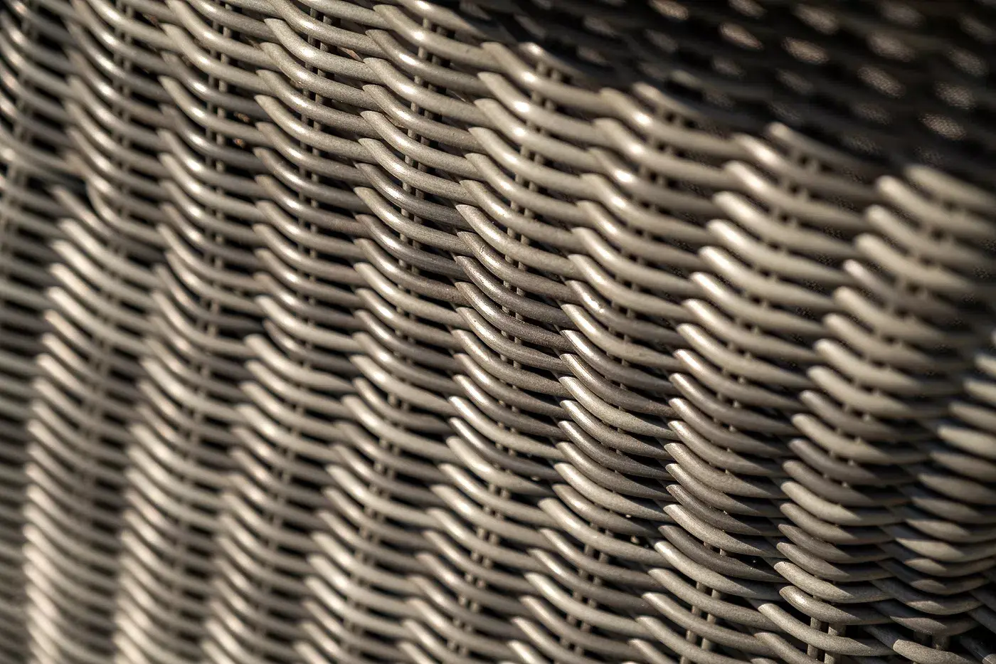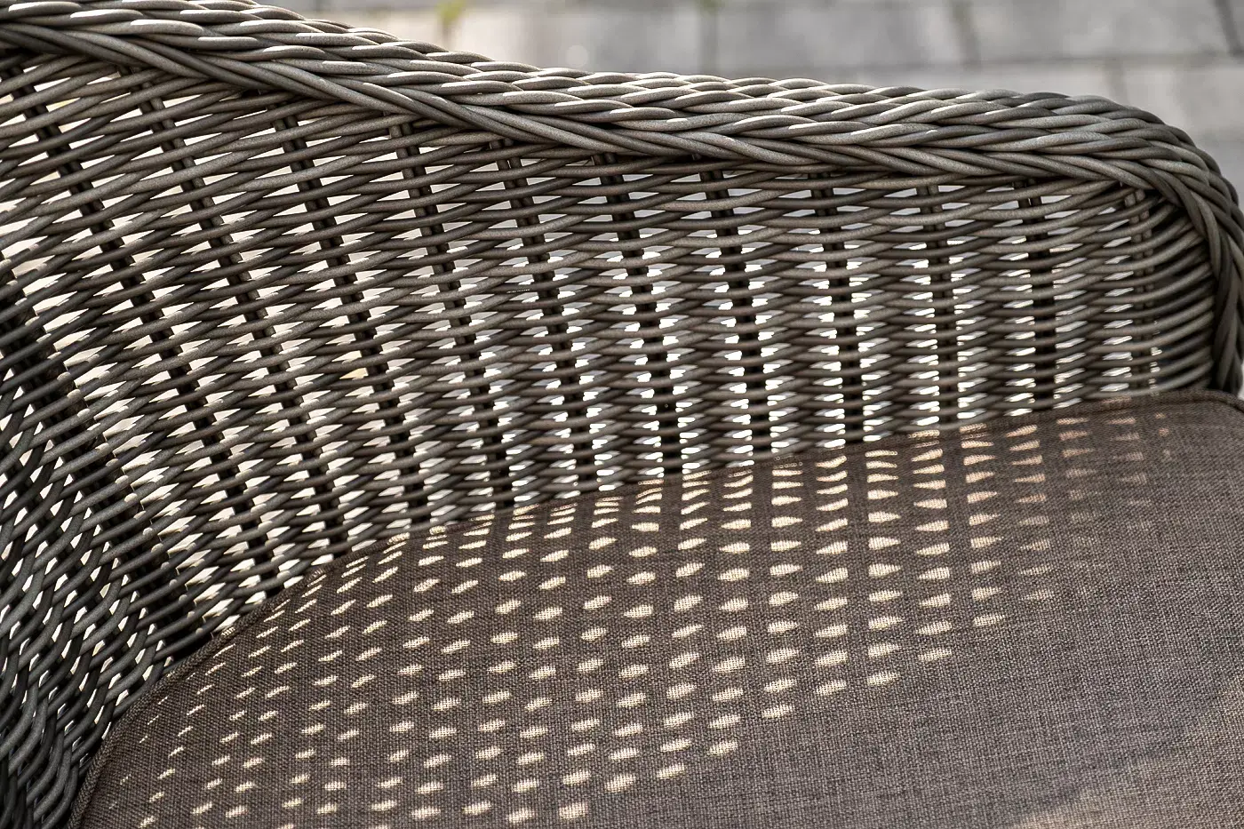 Вся мебель изготовлена из алюминия, поэтому ее очень легко перемещать. Декоративное покрытие выполнено из долговечного искусственного ротанга, устойчивого к перепадам температур и переменам погоды. Столешница изготовлена из прочного закаленного стекла 5 мм, кресла укомплектованы подушками серого цвета со съёмными чехлами.