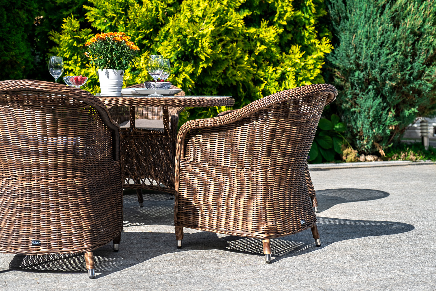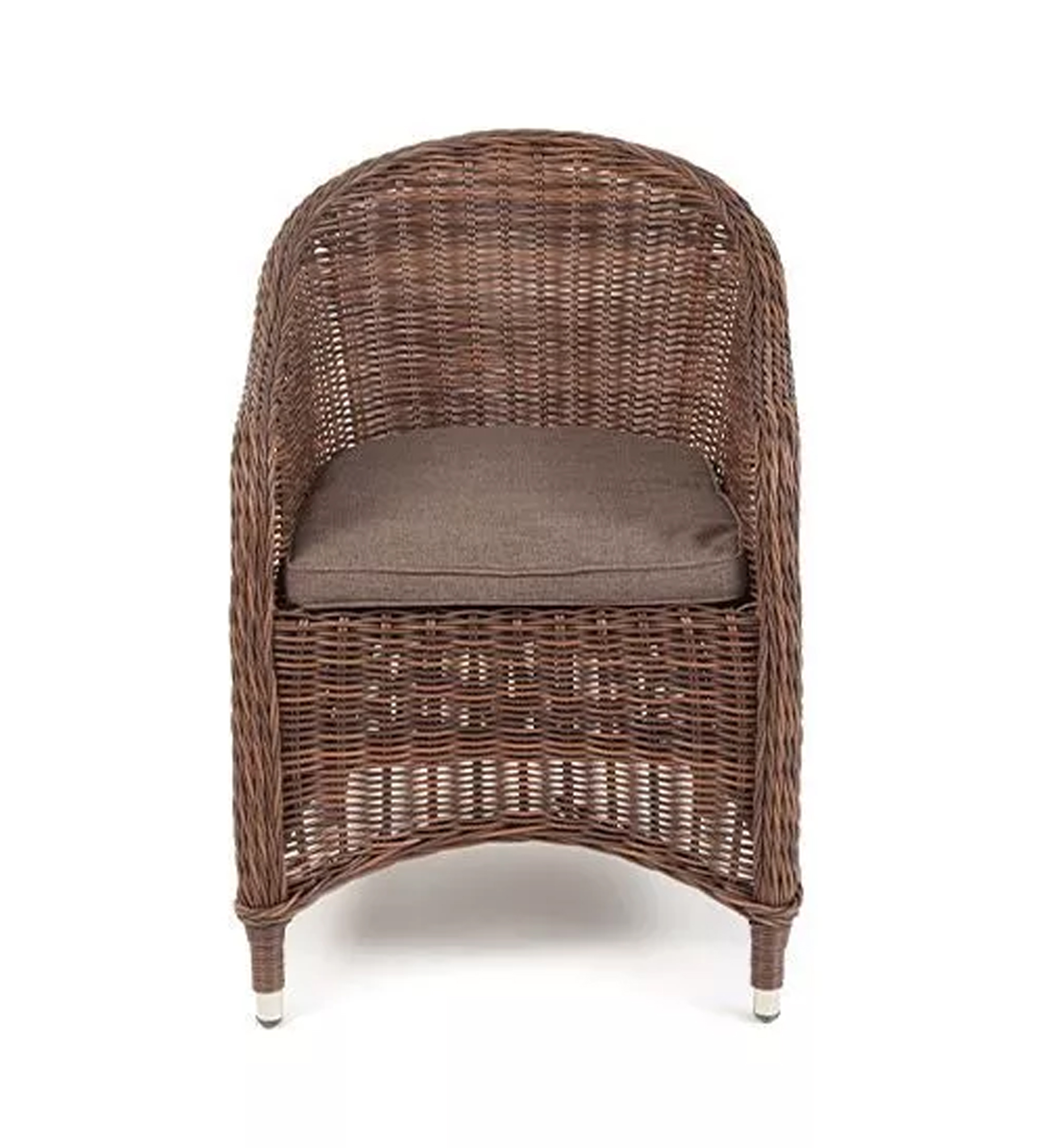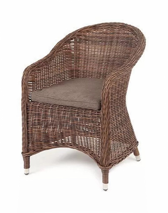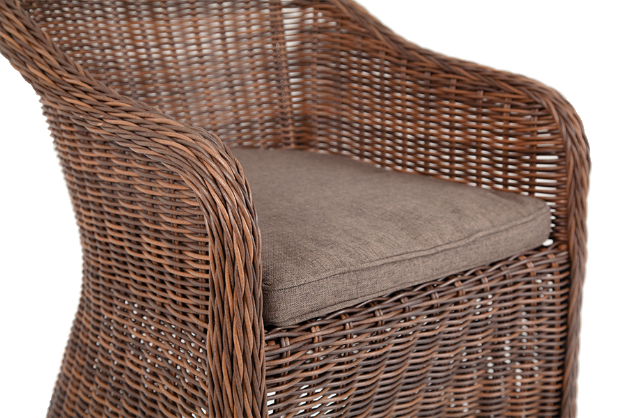 Кресло изготовлено посредством ручного плетения из искусственного ротанга коричневого цвета. Для укрепления конструкции использован алюминиевый каркас. Благодаря ему плетеное кресло остается легким, но прочным.
