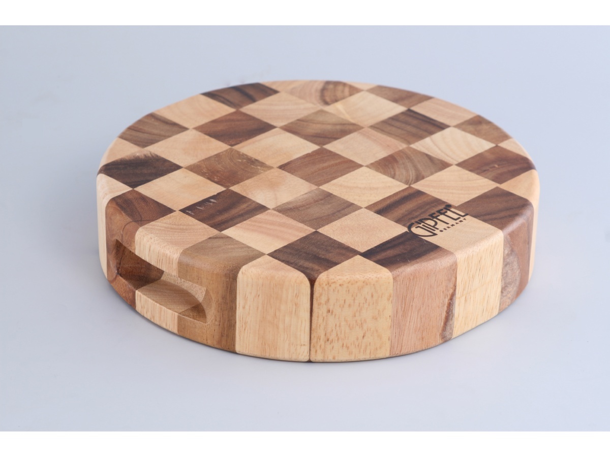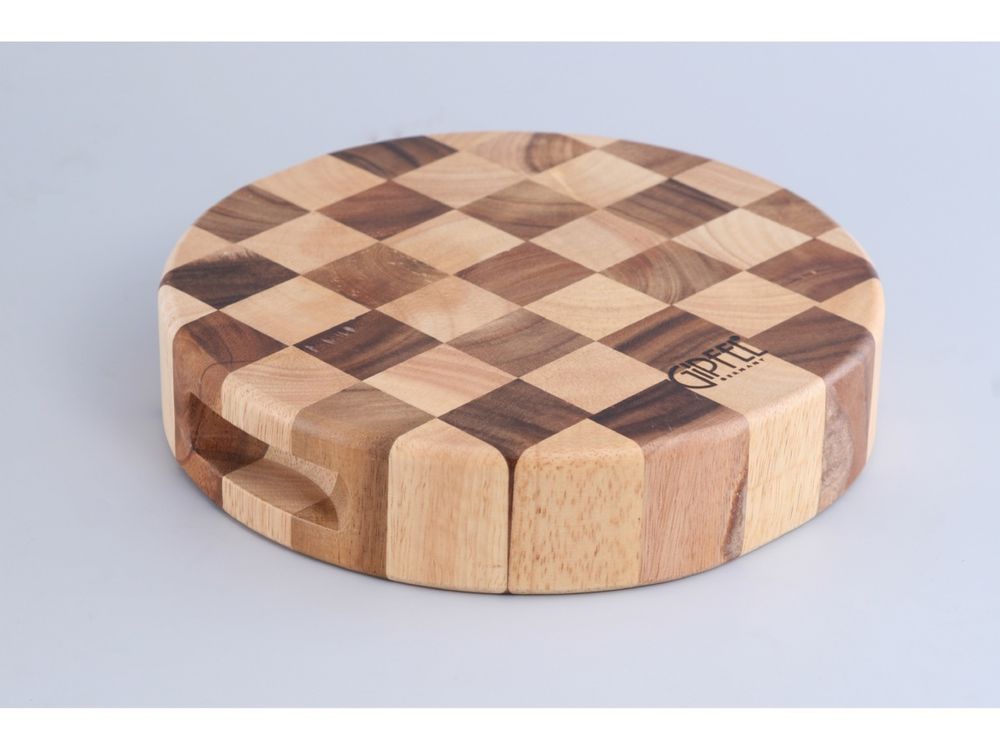 - деревянная двухцветная разделочная доска 'шахматы'- круглая с выемкой- комбинация темного и светлого дерева гевеи и акации- размер 23 х 5 см