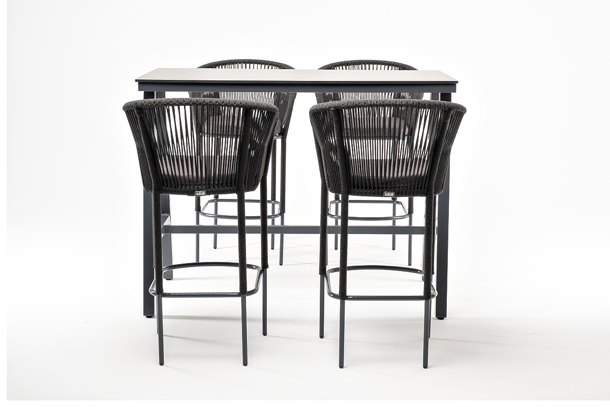 - 4 плетеных барных стульев «Марсель» из роупа, размером - 590×690×1100 мм, цвет роупа - темно-серый, каркас из стали, окрашен порошковой краской в серый оттенок.