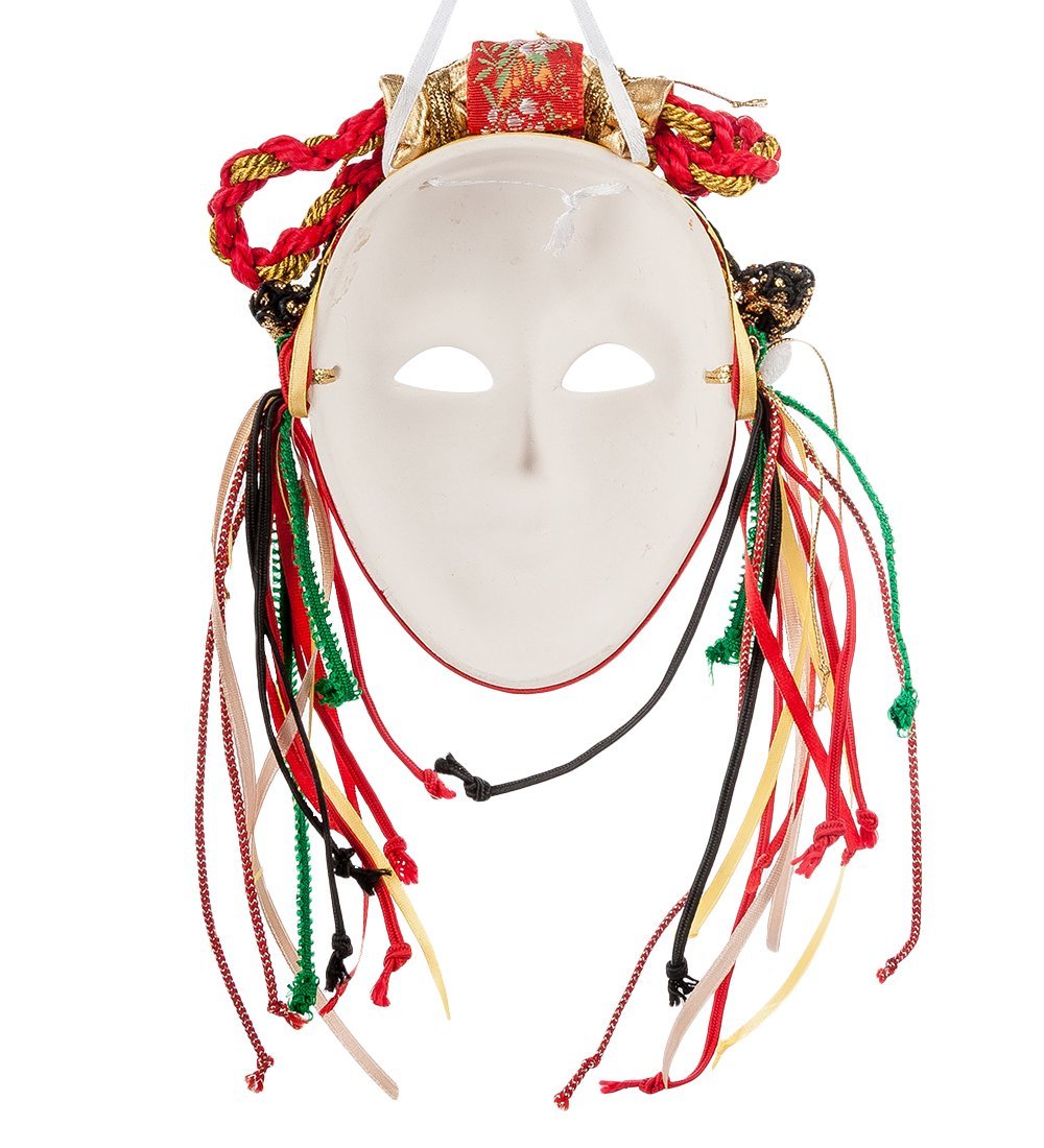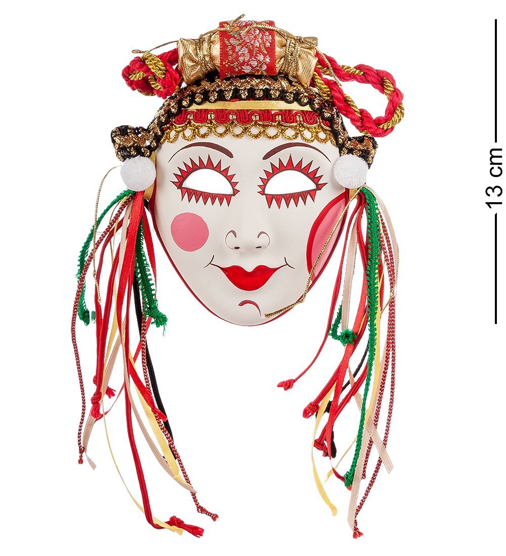 Маска «Масленица», сделанная из светлого фарфора и яркого текстиля, изображает улыбающееся женское лицо, наряженное в красно-золотую шапочку, края которой украшены разноцветными лентами. Женские щеки покрыты розовыми румянами, брови подведены коричневым карандашом, а ресницы выполнены в виде красных треугольников, которыми в старину изображали солнечные лучи.