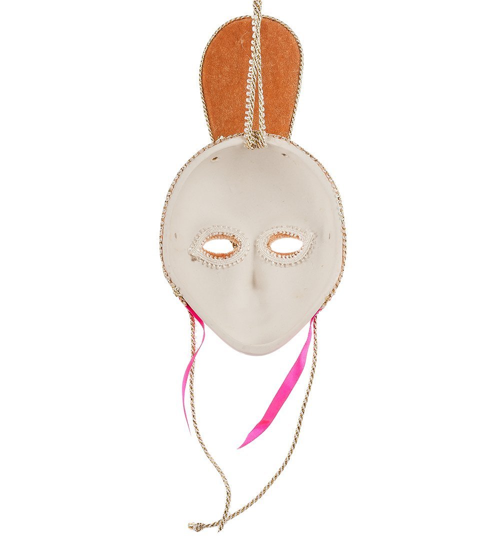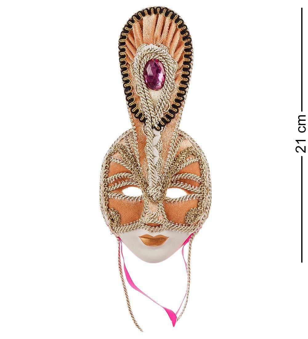 Маска "Перо" была одной из самых популярных в то время масок. Она выполнена в золотистых цветах, декорирована белыми и золотыми шнурами, но, что делает ее по-особенному изысканной и роскошной, так это большой ало-розовый камень, который венчает верх маски. Все эти особенности передают ее благородство и изысканность.