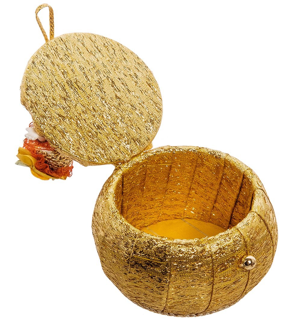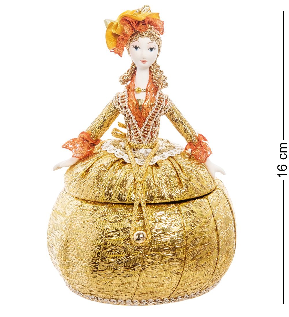 Для создании куклы-шкатулки мастер использовал качественные материалы. Лицо, руки выполнены из бисквитного фарфора, роспись сделана акриловыми красками. Основа нижней части шкатулки обтянута тканью. Шкатулку можно также использовать как упаковку для небольшого драгоценного подарка.