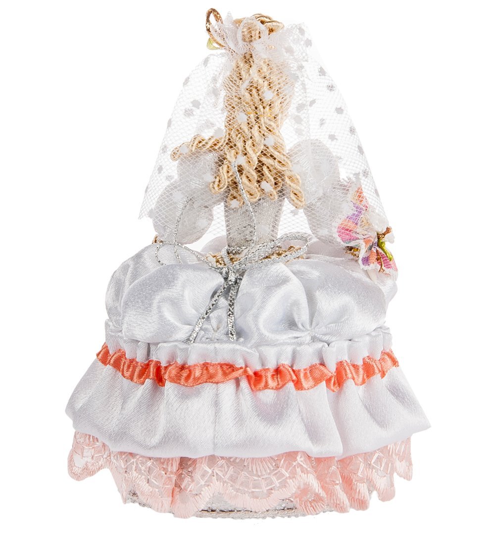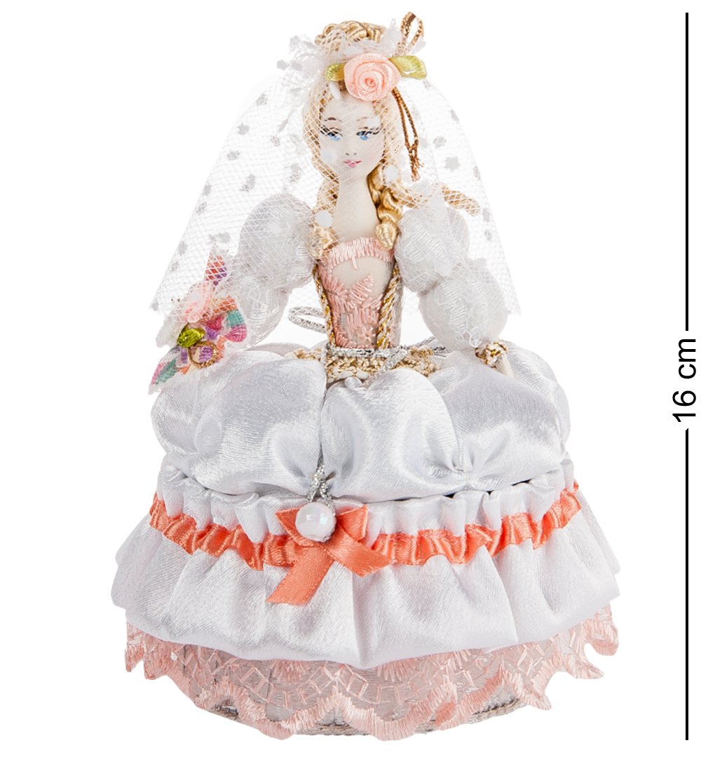 Изделие выполнено в виде юной привлекательной барышни, которая, по всей видимости, собирается на бал или важное мероприятие. Чтобы поразить окружающих своей красотой, барышня надела пышное ажурное платье, украшенное розочками и яркой отделкой. Кукла-шкатулка «Барышня» будет хранить ваши самые любые украшения, при этом дополняя интерьер своим безупречным образом.
