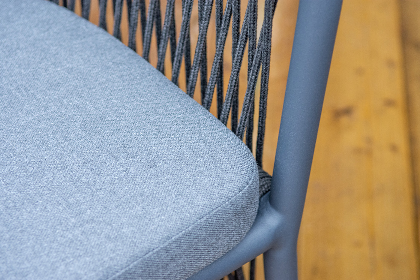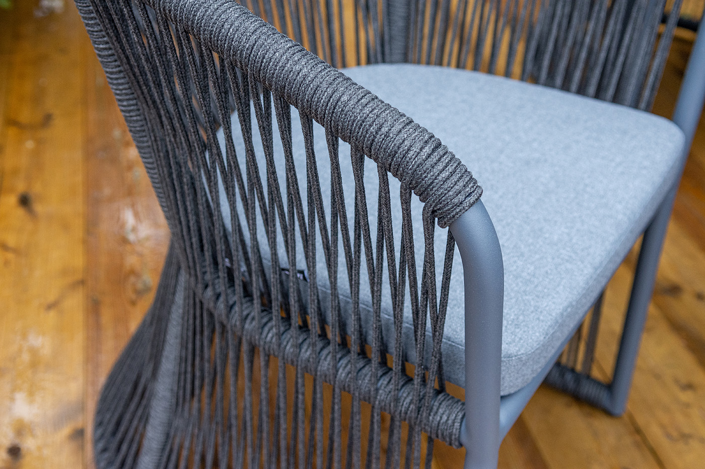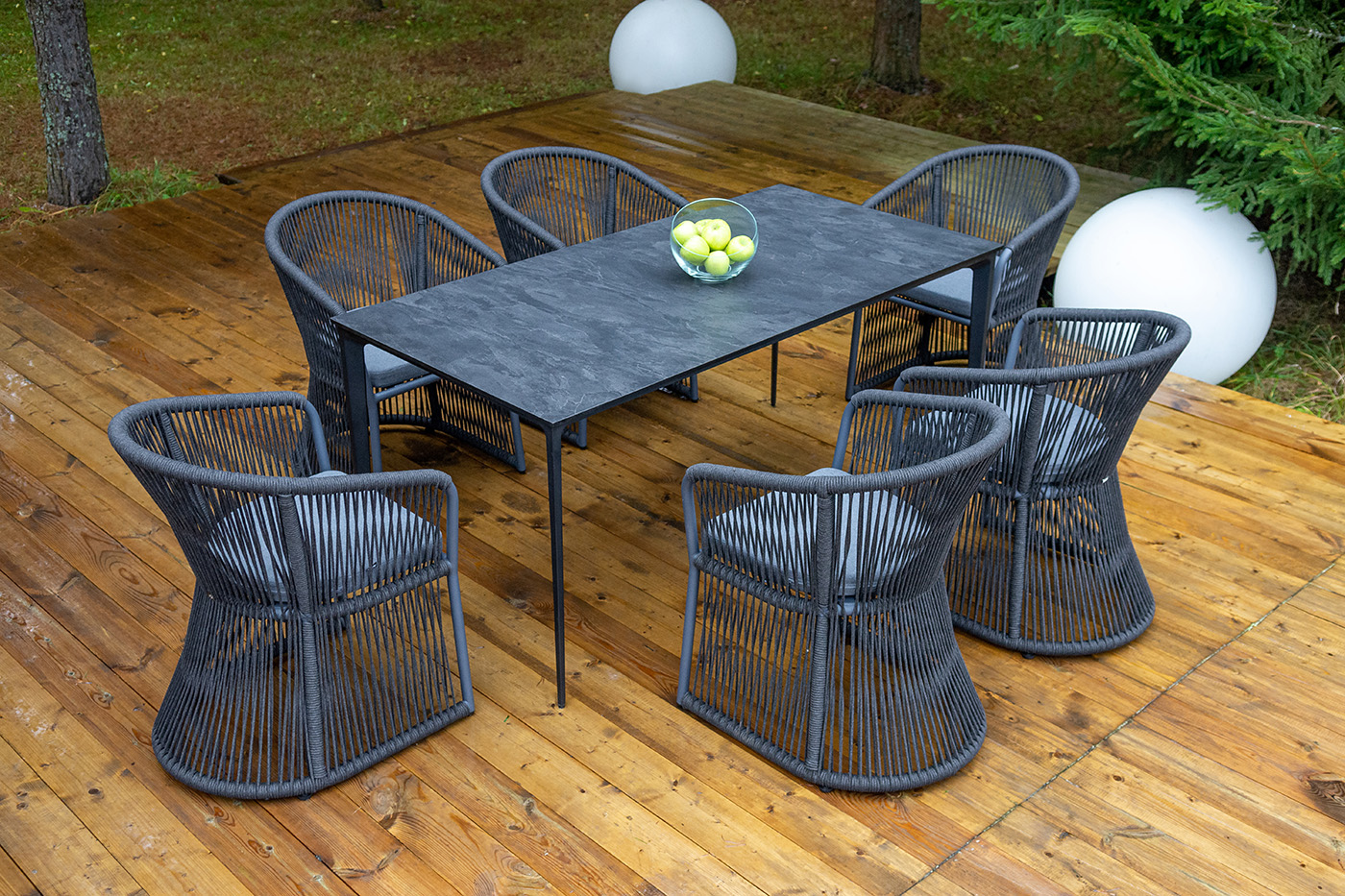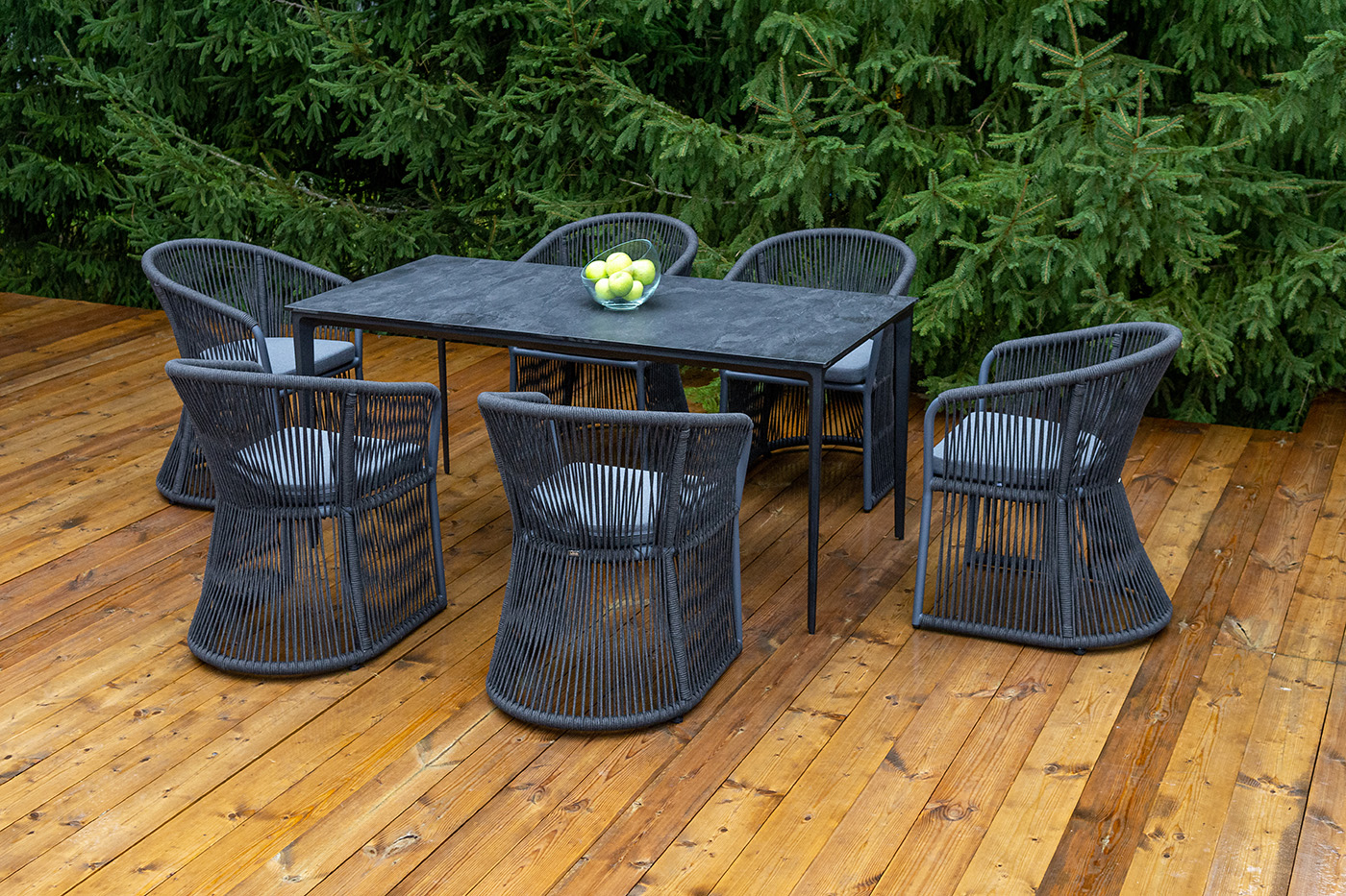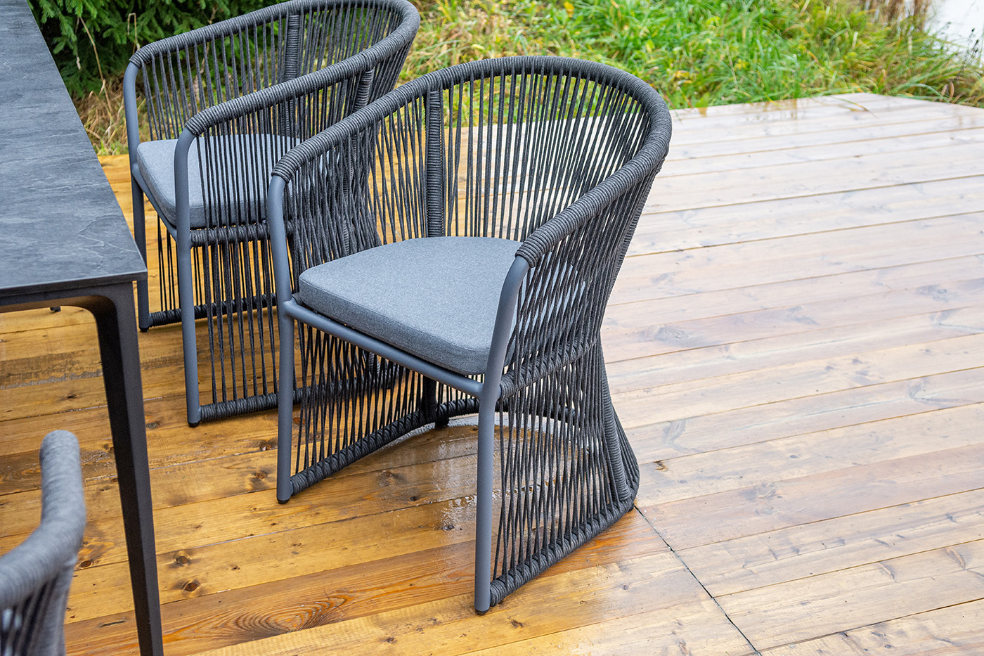 Дополняют комплект шесть плетеных стульев «Романо» из роупа. Габариты каждого стула — 580×590×780 мм. Каркас и оплетка выполнены в темно‑сером цвете, что создает единый стилистический ансамбль с столом. Роуп — эластичный и высокопрочный материал на основе полиэфирных волокон: он обеспечивает комфортную посадку, устойчив к износу и не требует сложного ухода.