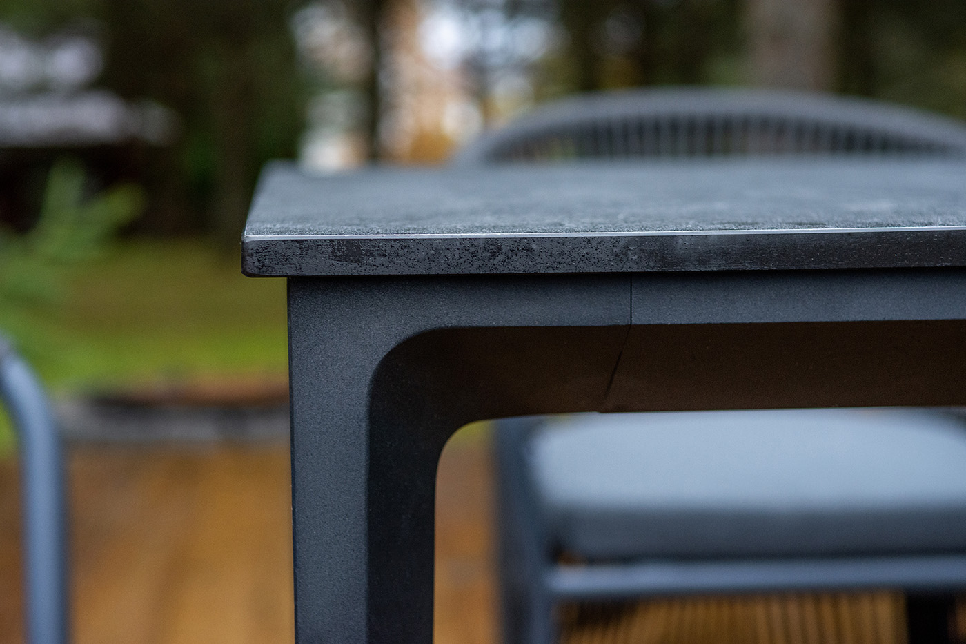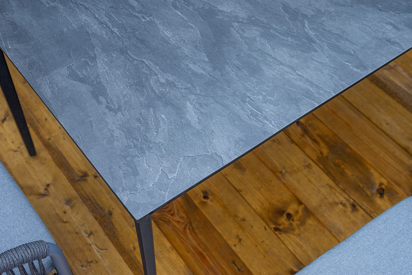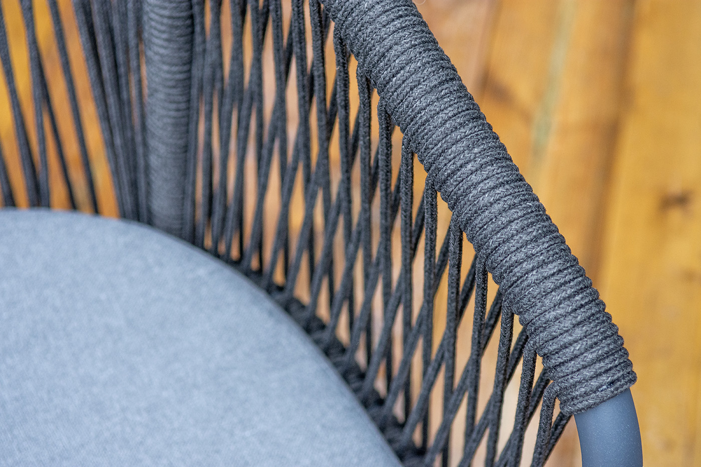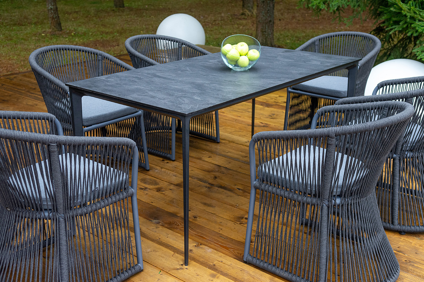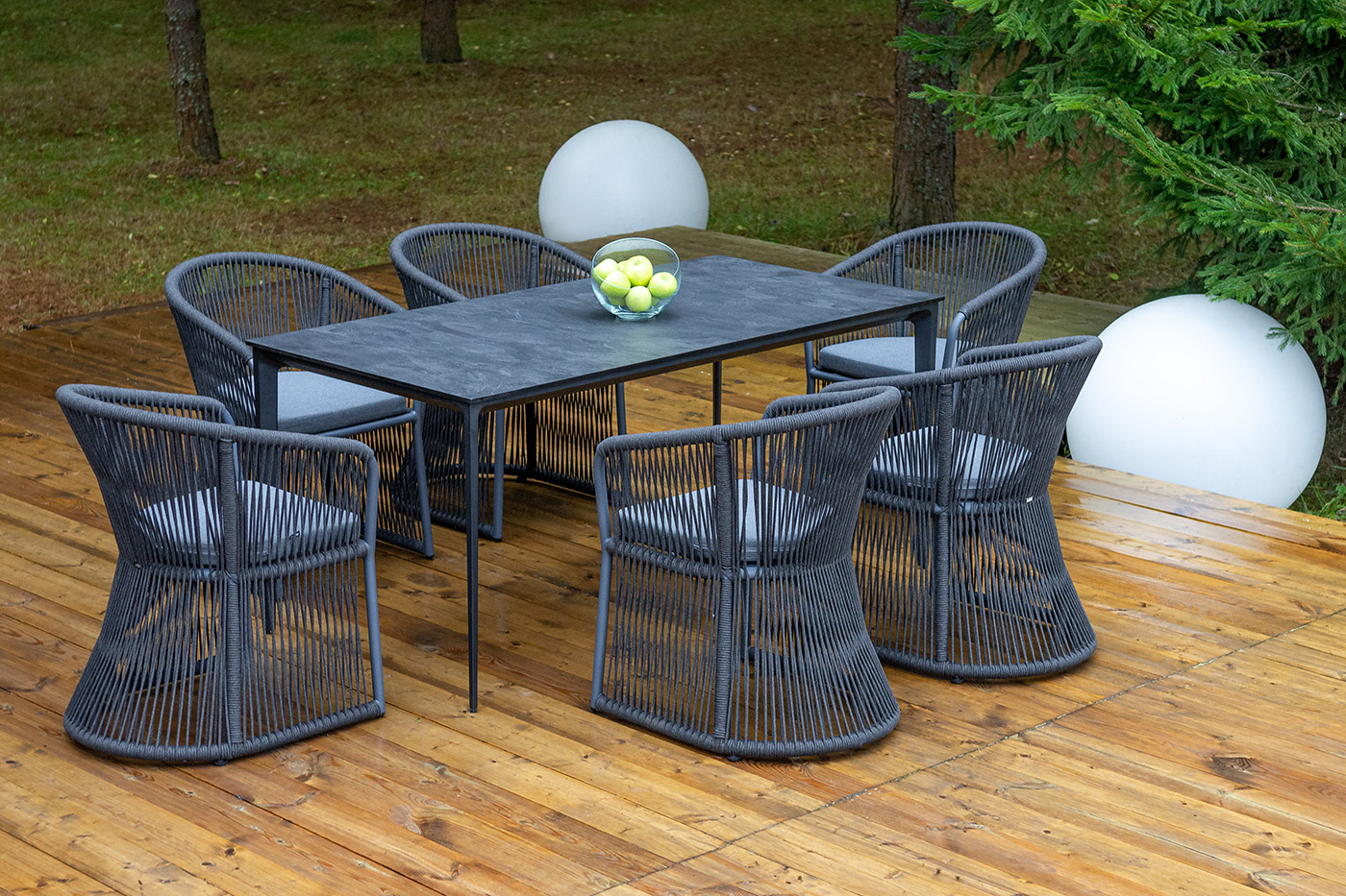 Дополняют комплект шесть плетеных стульев «Романо» из роупа. Габариты каждого стула — 580×590×780 мм. Каркас и оплетка выполнены в темно‑сером цвете, что создает единый стилистический ансамбль с столом. Роуп — эластичный и высокопрочный материал на основе полиэфирных волокон: он обеспечивает комфортную посадку, устойчив к износу и не требует сложного ухода.