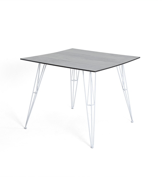 Основание изготовлено из металла, окрашенного в белый цвет. Столешница - из современного композитного пластика HPL неоднородного светло-серого оттенка, толщиной 12 мм. Это очень практичный, устойчивый к агрессивному воздействию извне материал: попаданию влаги, мытью химическими веществами. На это покрытие можно ставить горячие тарелки и чашки. Столик также можно использовать в открытых помещениях или на улице.