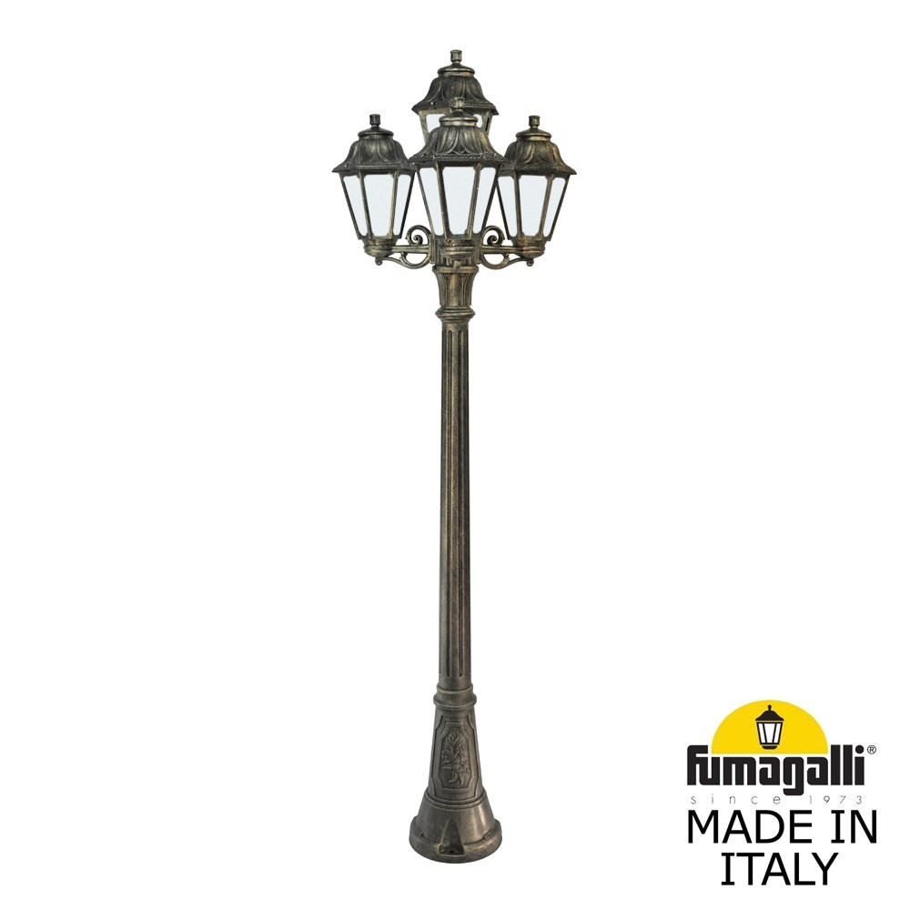 Садово-парковый фонарь FUMAGALLI серии ANNA, модель ANNA/ARTU/BISSO 3+1. Парковый торшер, столб ARTU с тремя уличными фонарями ANNA на двух малых консолях BISSO и одним светильником на опоре. Используются для архитектурного и ландшафтного освещения в стиле "классика". Место установки столбиков освещения - парковые дорожки, cкверы, садовые участки, тротуары, а так же ландшафтные и архитектурные объекты. Могут устанавливаться и внутри помещений в качестве декоративных уличных фонарей. Изготовлены в Италии, по уникальным технологиям "FUMAGALLI" из современного композитного полимера RESIN. Этот материал в 5 раз прочнее металла, не ржавеет, не окисляется, не выгорает на солнце, его не нужно красить. Все светильники пыле-влаго защищены по стандарту IP55 (защита от пыли, защита от струй воды, падающих под любым углом). Рассеиватель выполнен из антивандального, не мутнеющего и не горючего PMMA (ПолиМетилМетаАкрилат). Срок службы светильника - не менее 20 лет. Температура использования от -60 до +90. В серии ANNA есть фонари в настенном (BISSO/ANNA, PORPORA/ANNA) подвесном (SICHEM/ANNA, SICHEM/ANNA 3L) и наземном исполнении (IAFAET.R/ANNA, ALOE.R/ANNA, ARTU/ANNA, GIGI/ANNA, RICU/ANNA, RICU/ISSO/ANNA 1L, RICU/ISSO/ANNA 2L, RICU/ISSO/ANNA 3L) со столбами разной высоты, с разным количеством и конфигурацией голов. Консоли настенных фонарей и кронштейны светильников на столбах освщения могут устанавливаться вверх/вниз. Столбы выше 150 см имеют в основе мощную стальную трубу с двойной оцинковкой. При заказе требуется выбрать цвет корпуса, цвет плафона и тип патрона (Е-27 или LED GX-53). Возможен светодиодный вариант. По стилю и дизайну серия уличных светильников ANNA похожа на светильники среднего размера серии RUT и на светильники большого размера серии NOEMI. По размеру ANNA относится к малым светильникам как серия SABA и GLOBE 250.