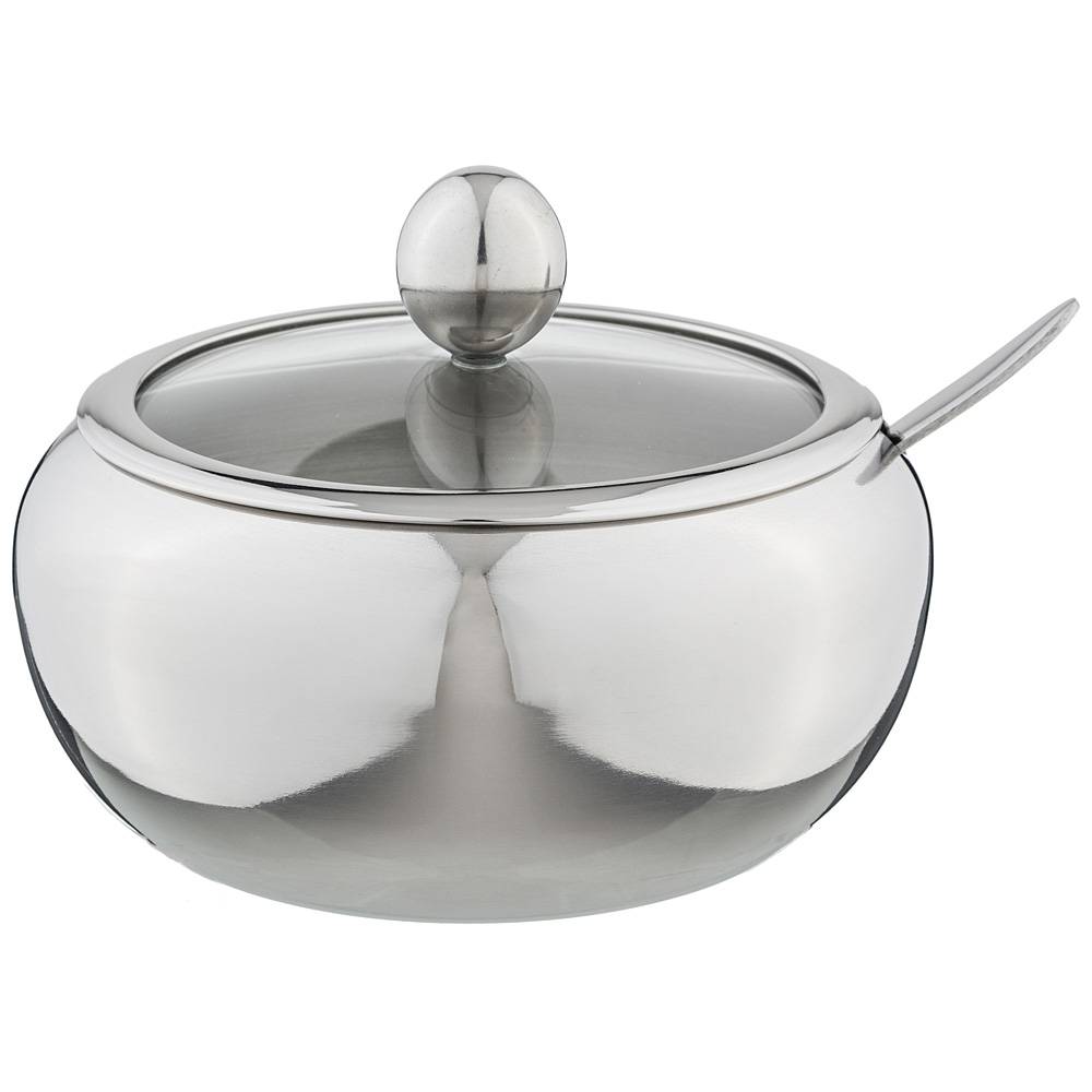 Сахарница выполнена из нержавеющей стали, имеет прозрачную крышку, сквозь которую видно количество содержимого, и ложечку для насыпания, которая располагается в выемке на корпусе сахарницы.