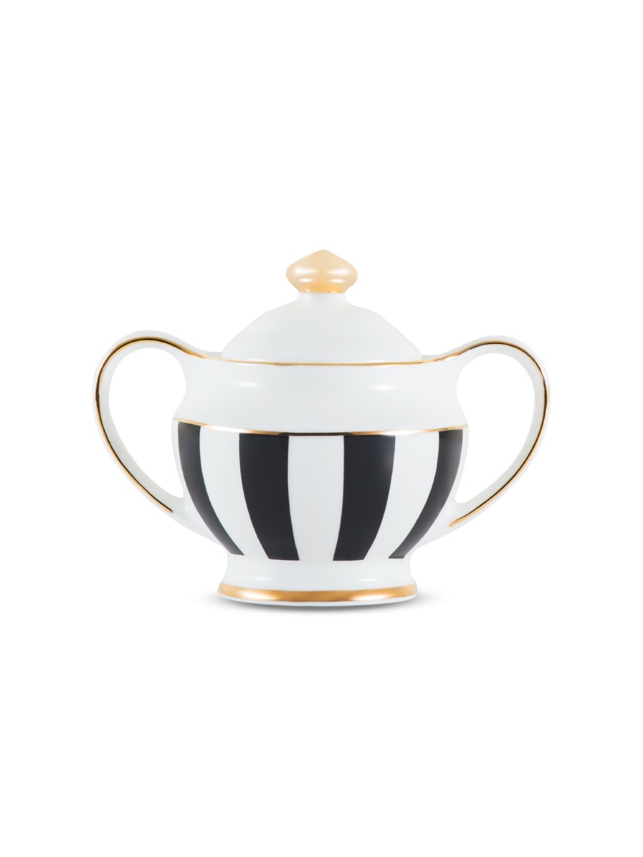 Сахарница GIPFEL MODERN 3955. Объем 250мл. Сахарница сделана из костяного фарфора белого цвета с черными полосами. Имеет две ручки по бокам. Сочетается с другими предметами сервировки коллекции MODERN.