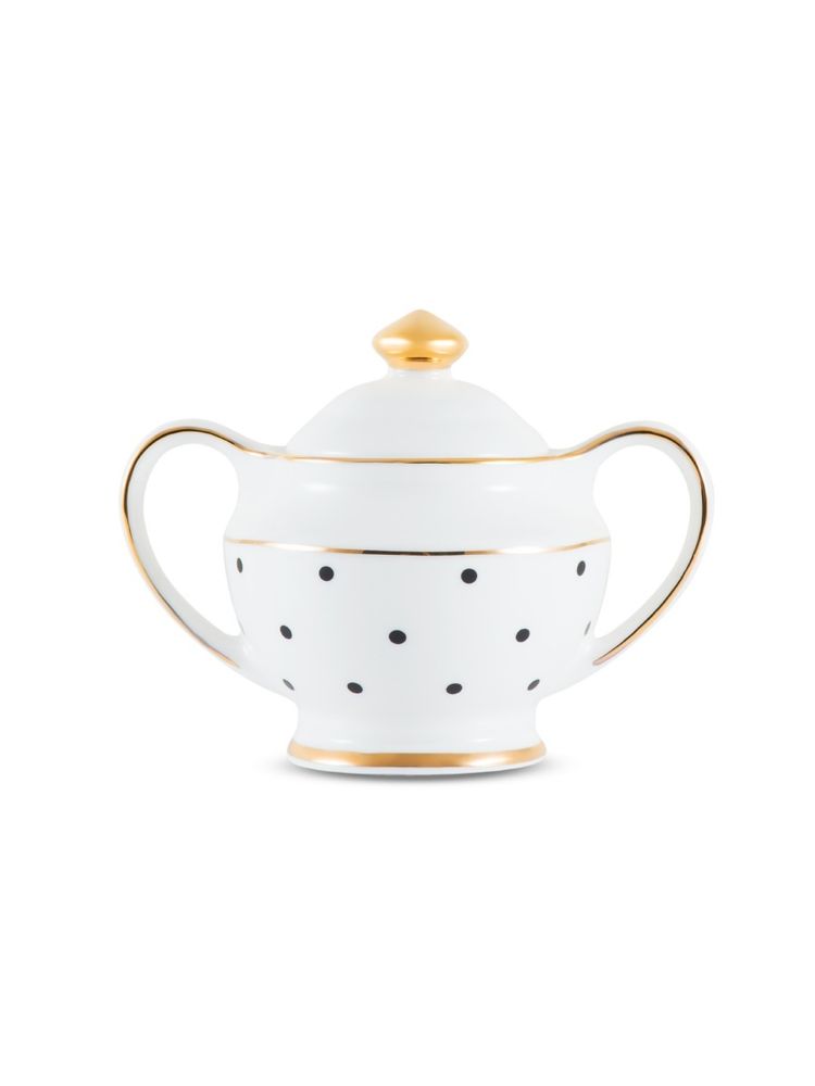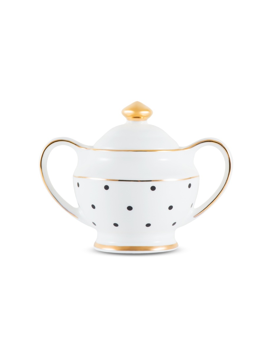Сахарница Gipfel MODERN 3957. Объем 250мл. Сахарница сделана из костяного фарфора белого цвета в черный горох. Имеет две ручки по бокам. Сочетается с другими предметами сервировки коллекции MODERN.